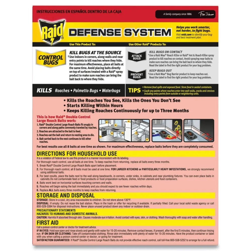 Raid Double Control Roach Baits kill the roaches you see as well as the ones you don’t see with two types of bait. After roaches feed on the bait, they return to the nest and transfer the bait to the others. Population reduction and less activity can be expected within days, with the baits working continuously for up to three months. Raid Double Control Roach Baits are child-resistant. Read label before use. Use only as directed.