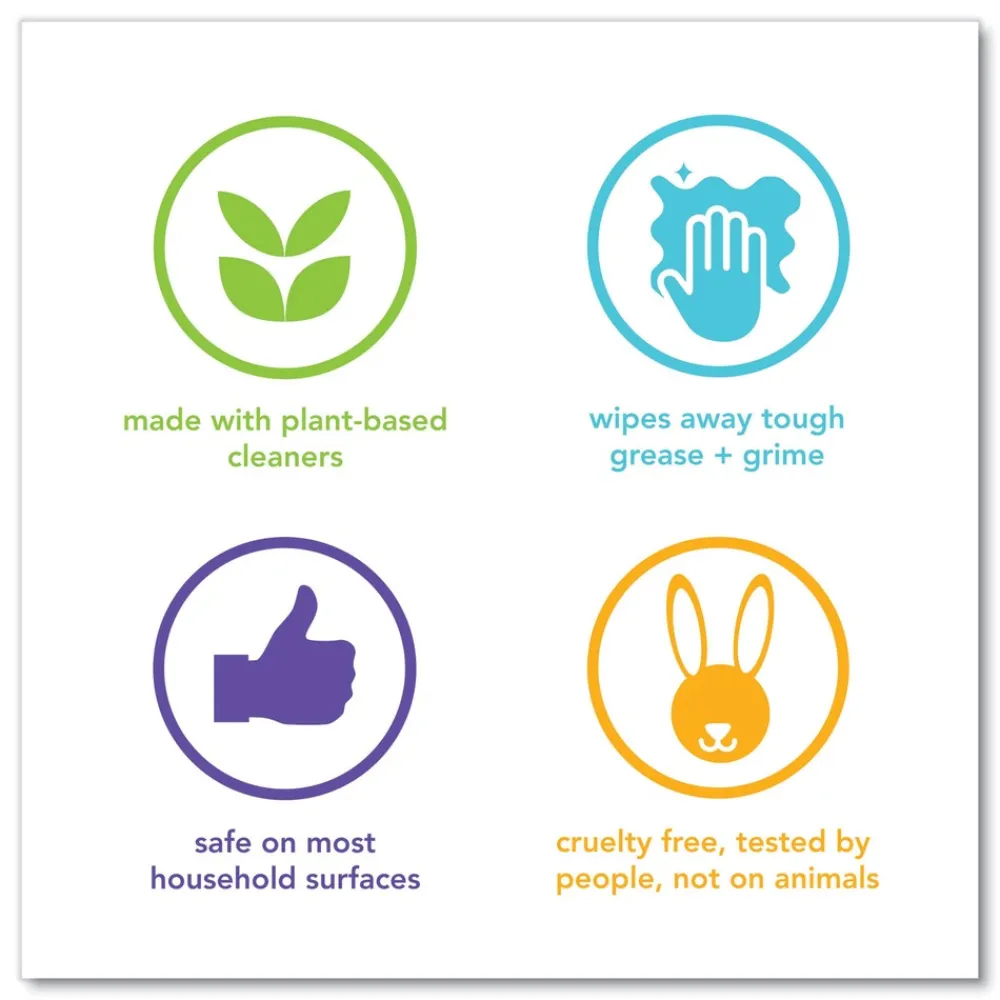 Put the hurt on dirt. Grease and grime don’t stand a chance. Not with plant-based cleaning agents on your side. Each wipe, in all its great-smelling glory, packs a powerful cleaning punch, with cleansers derived from corn + coconut. They wisk away spills and splatters with ease, leaving behind the pleasant smell of victory.