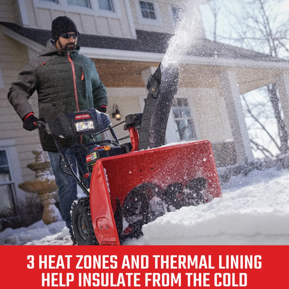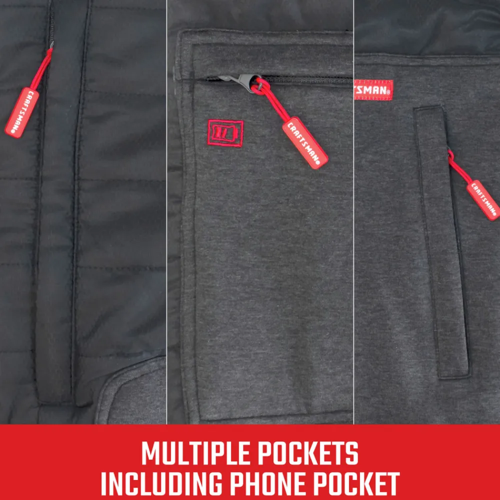 CRAFTSMAN Men’s Hybrid Heated Jacket Whether working outside in cold weather, attending winter sporting events, walking the dog in inclement weather, or just keeping warm on a cold and blustery day, the CRAFTSMAN Men’s Hybrid Heated Jacket provides hours of core body warmth and continuous heat. This jacket features 3 core heat zones and 3 temperature settings with pre-heat to control and change the level of heat as weather and activity conditions change. The outer ripstop quilted polyester shell and knit sleeves are wind and water resistant, the fleece lining is soft and comfortable, and the poly taffeta sleeve lining allows for an easy on and off. Fully outfitted with a CRAFTSMAN V20 Lithium-Ion battery and an adapter for charging portable accessories, he’ll appreciate the durability and reliability of this stylish and functional hybrid heated jacket at work and at play.