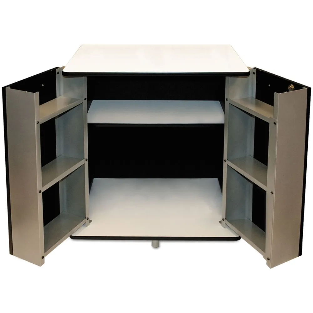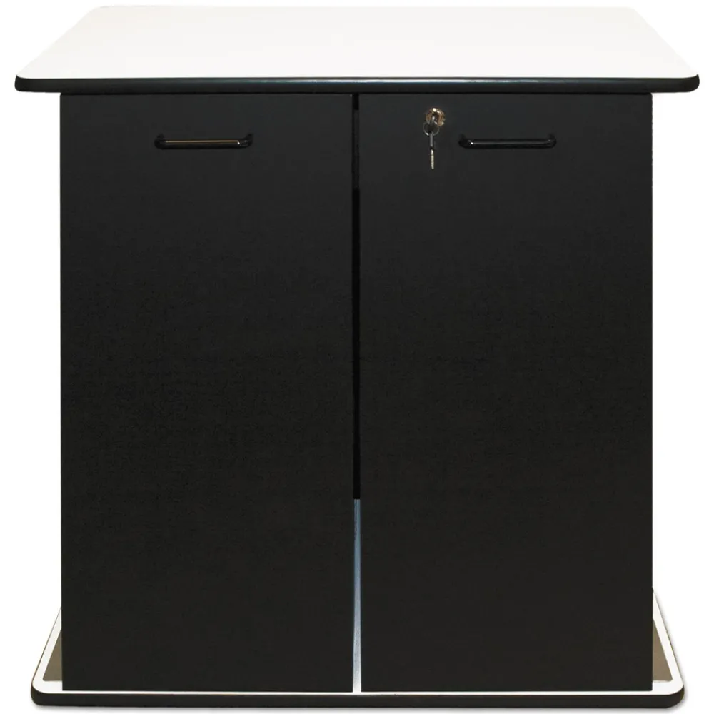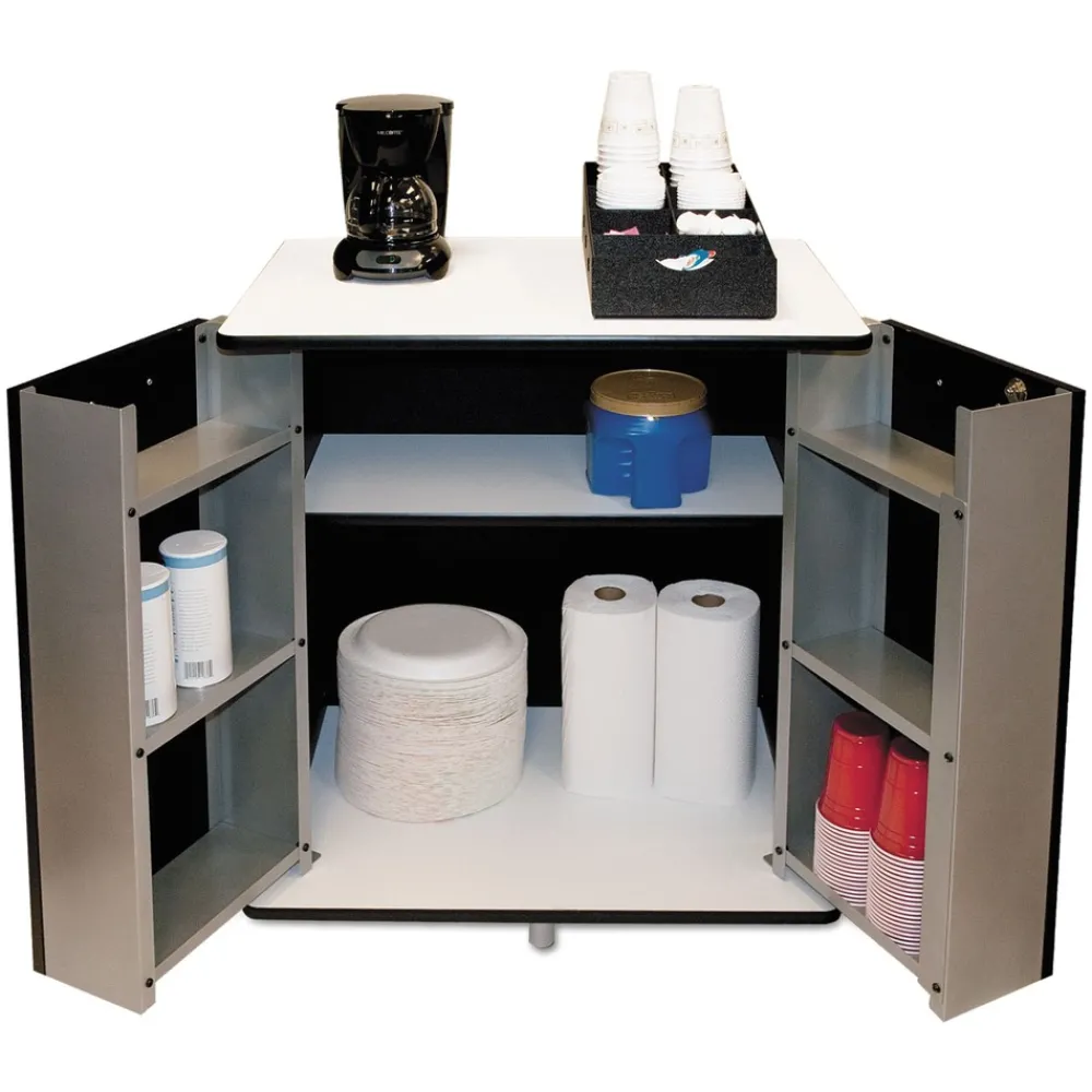 The perfect breakroom addition, holds different types of small objects, cups, utensils. Made of built to last plastic. Spacious top can support microwave or coffee maker. Surface is constructed to resist stains and scratches. Internal shelves can accommodate large-sized supplies. Doors open with ease for frequently used items.