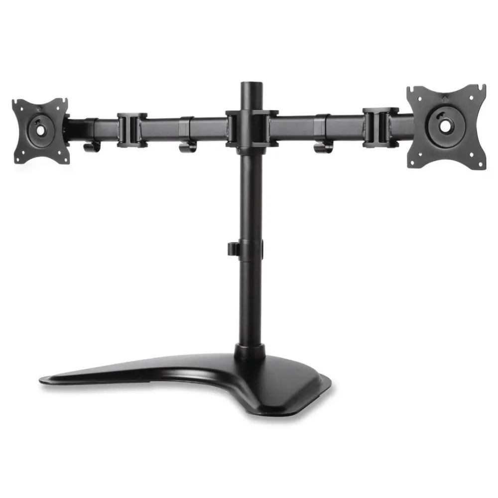 Freestanding desktop dual monitor arm fits monitors up to 27 in. and up to 18 lbs. per monitor. Height easily adjusted for an optimal ergonomic position. Fully articulating design provides 360-Degree rotation, 180-Degree swivel and ±45-Degree tilting for any viewing perspective. Cable clips for cable management. Monitor arm has a heavy steel base for excellent stability.