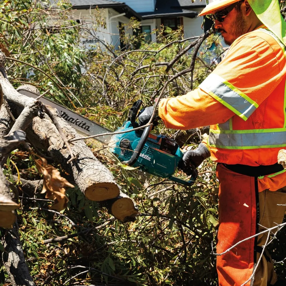 Landscapers and contractors are demanding more cordless alternatives to gas-powered outdoor power equipment. Makita is meeting demand with an expanding line of cordless OPE, including the 40V MAX XGT Brushless 18 in. Chain Saw (GCU04T1). With zero emissions, lower noise, and considerably less maintenance, the GCU04T1 is a welcome solution for cutting and trimming applications. It’s powered by one 40V XGT Battery for power and longer run time, and with the efficient Makita-built brushless motor users get high power efficiency that is equivalent to a 42cc gas chain saw. The GCU04T1 has an 18 in. Guide bar and Makita-built motor with a variable-speed trigger that delivers 0 – 5020 FPM for increased cutting speed. It has zero emissions and reduced maintenance: there’s no engine oil to change, no spark plug to replace, and no air filter or muffler to clean. And there’s no need to drain the fuel for storage. Convenience features include lateral chain tensioning with dual stud for efficient chain retention, captured bar nuts, adjustable automatic chain lubrication with large oil reservoir, and a built-in L.E.D. on/off switch with auto power-off function which automatically shuts the saw off when operation is delayed, for extended battery life.