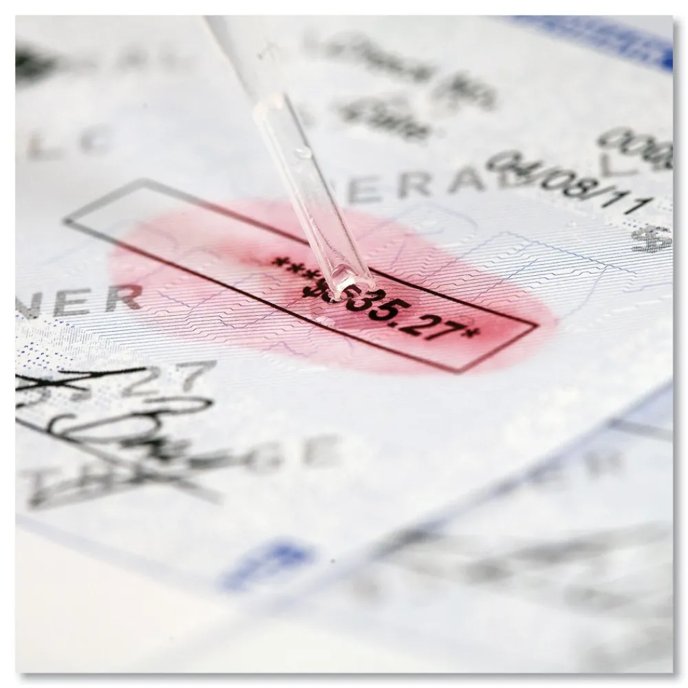 Hidden security feature releases a red stain if chemical alteration is attempted.