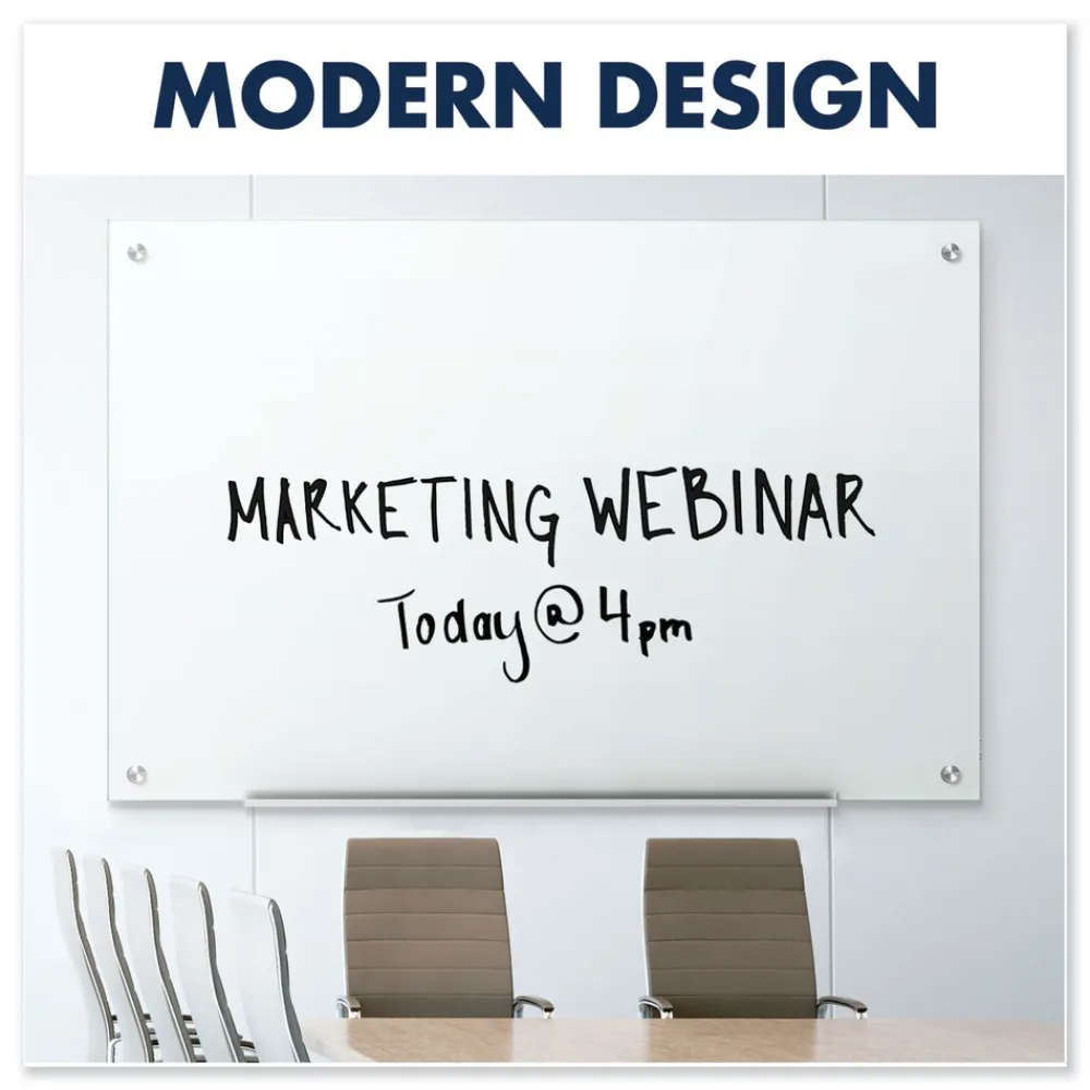 Ultra-modern, tempered-glass-surface whiteboard delivers high-quality performance. Durable, tempered-glass provides a smooth writing platform that erases cleanly after every use, preventing ghosting and staining. Write with any dry-erase marker. Less porous and absorbent than standard whiteboards, this board will maintain its impressive appearance for years to come, even under frequent-use conditions. Frameless board is a good fit for any contemporary office. Hardware is included for simple and secure wall mounting. Occasional cleaning is recommended for best performance.