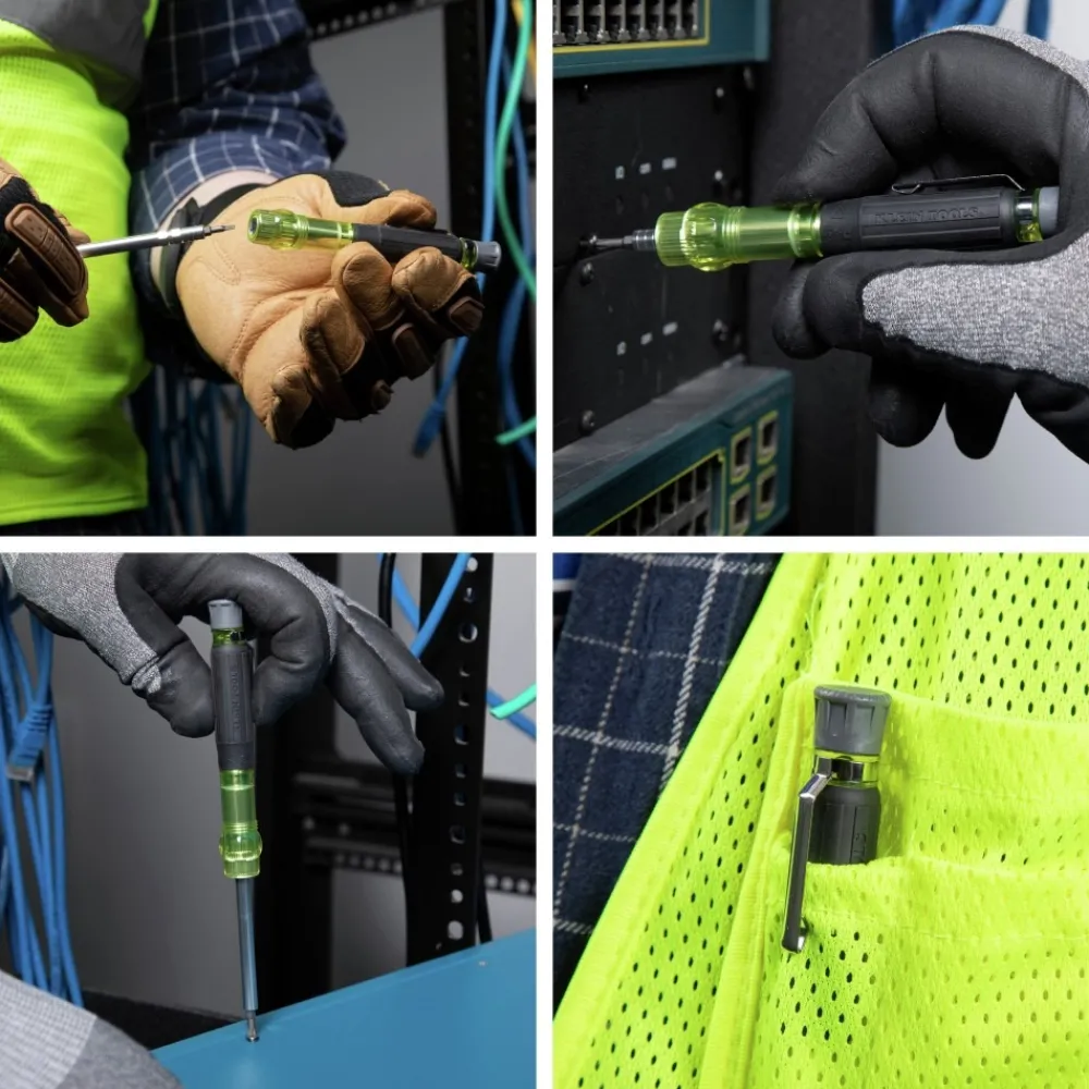 The Pocket 4-in-1 Electronics Screwdriver has a concealable tip and a pocket clip for convenient pocket storage. To use, simply slide the cuff back to expose the tip and shaft. Flip the barrel to the long-side shaft to extend your reach. This driver is designed for precision work. It features a swivel cap for optimum control, outstanding comfort with our exclusive cushion-grip handle, and precision milled tips to fit screw openings securely. Corrosion-resistant anodized aluminum barrel that includes two double-ended bits made of the highest quality tempered steel, carefully heat-treated for maximum strength.