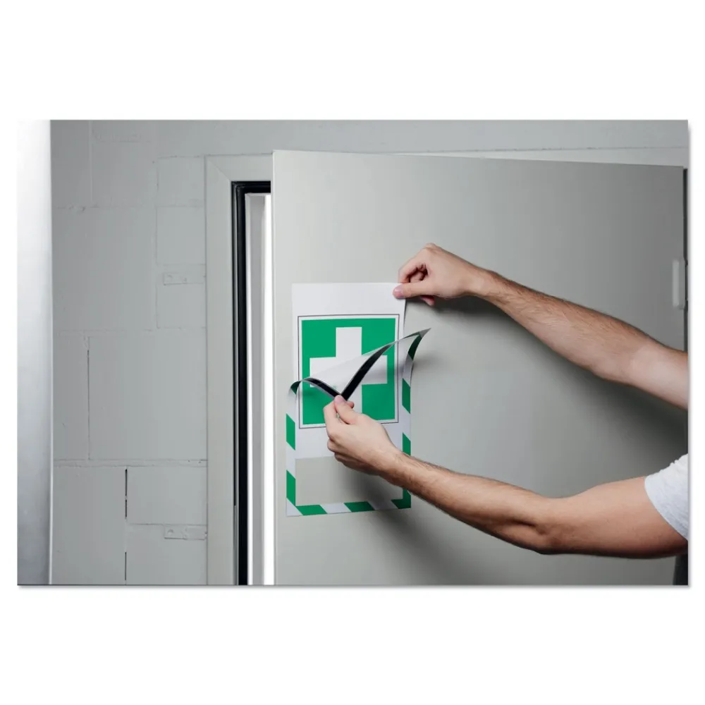 DURAFRAME Magnetic OSHA Safety Sign Holders from DURABLE are the go-to solution for effortless professional security signage displays. Easily showcase important caution, safety and warning information on any smooth, magnetic metal surface with these professional frames, instantly grabbing attention and effectively conveying your message right where you need it. Keep your messaging up to date with the innovative flip-up magnetic frame. This unique design means you can update safety information without any hassle. Simply lift the frame, swap out your content, and secure it back in place with the magnetic closure. This keeps your safety signage updated and relevant for your employees and customers.With no bulky mounting hardware or unsightly tape, these safety sign holders have a sleek and modern appearance. DURAFRAME’s strong magnetic backing securely attaches to any smooth, magnetic metal surface, so you don’t have to worry about the inserts dropping out. It can be repositioned easily, giving you the flexibility to adjust your signage as needed. Tailor your signage to fit your unique space perfectly by placing DURAFRAME in portrait or landscape orientation. OSHA safety border frame is ISO 3864-4 safety color compliant for displaying danger, safety and warning information, including safety markings, directional displays, hazard and warning info, and emergency protocol. Ideal for fast-paced and high-traffic environments such as warehouses, healthcare facilities, manufacturing plants, restaurants, retail stores, hotels, and offices. DURAFRAME Magnetic Sign Holders offer practicality and versatility for your signage needs. For over 100 years, DURABLE has been synonymous with quality, design, and functionality. As a testament to this legacy, DURABLE products combine innovative design with a wealth of experience. Therefore, this is why DURAFRAME isn’t just a sign holder; it’s a commitment to presenting your business professionally. This unparalleled quality and attention to detail ensures your signage makes a lasting impression.