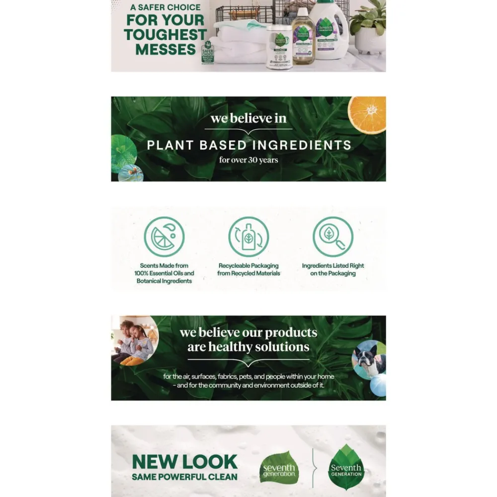 Hang wash-day worries out to dry. Unique formula contains plant-derived cleaning agents and triple enzymes to make short work of even tough stains, but is gentle. Powers through tough wash day challenges without dyes, optical brighteners or synthetic fragrances. Clinically tested hypoallergenic and non-irritating to skin. Designed for standard and HE machines, and works well in all temperatures. For more than 25 years, Seventh Generation has been thoughtfully formulating safe and effective plant-based products that work. Really well. You may also notice a cute Leaping Bunny seal on our products. That means we never test our products on animals and our products do not contain animal-based ingredients. Based in Vermont, Seventh Generation is proud to be a Certified B Corporation.