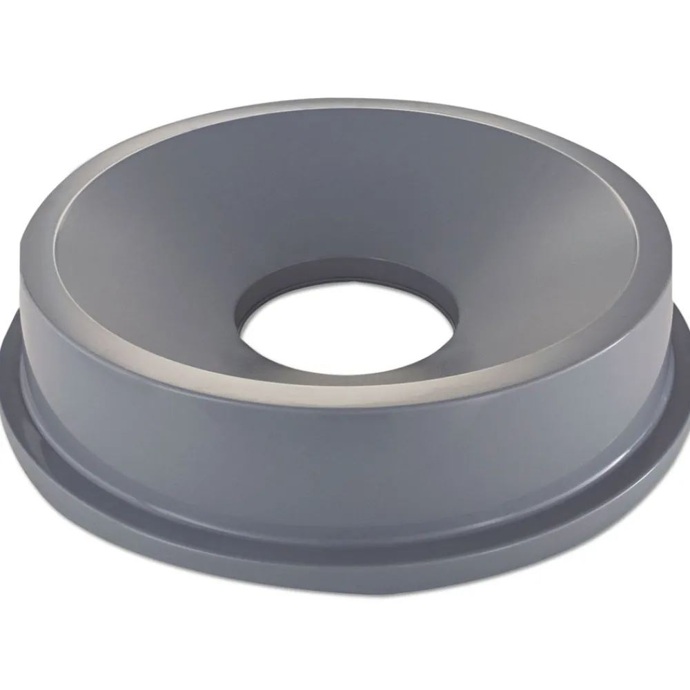 The Rubbermaid Commercial Trash Can Funnel Top fits heavy-duty 32 Gallon Rubbermaid trash cans (sold separately). This trash can lid is round, injection-molded, and resists moisture and certain chemicals. An ultraviolet (UV) stabilizer minimizes fading and discoloring.