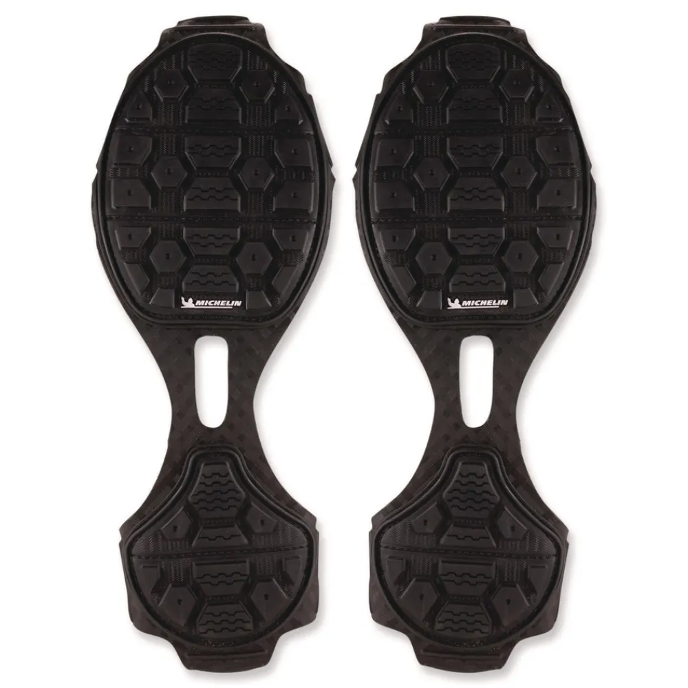 TREX Spikeless Traction Devices for shoes reduce the risk of slips and injuries by providing spike-free traction on slick surfaces. Powered by Soles by Michelin, these are the industry’s most advanced spikeless traction device. Designed for work environments where spiked ice cleats are not preferred, these shoe and boot grips make for easy and safe transition between indoor and outdoor. To achieve traction without spikes, the treads are constructed with a Michelin ice control compound, the same innovative technology found in their winter driving tires. Strategically placed grooves allow for efficient water evacuation when pressure is applied. Preventing water build-up is particularly beneficial on smooth indoor surfaces. Micro-pumps increase adhesion by properly distributing pressure to maintain high surface contact on icy surfaces. The tread is designed with block springs that create additional surface area for increased grip on snowy surfaces.