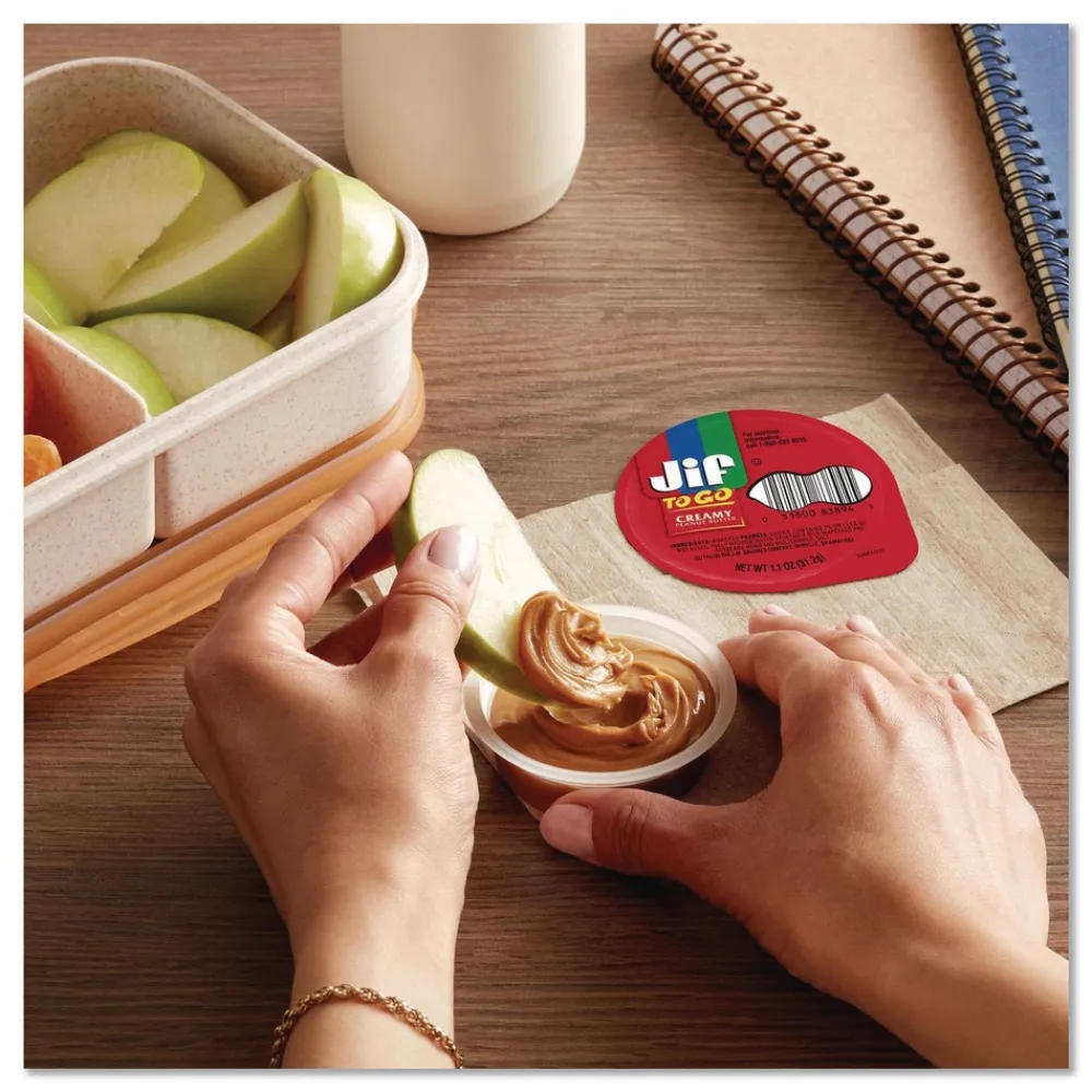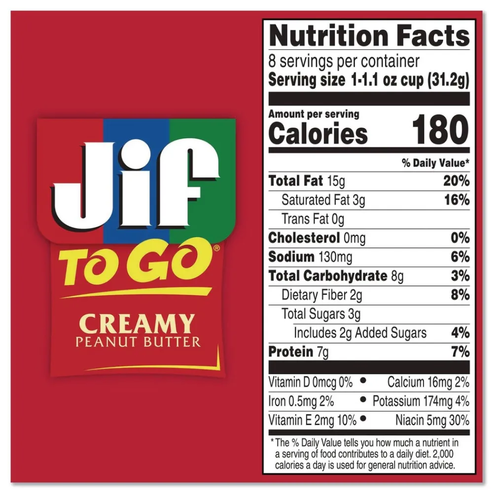 Bring your favorite peanut butter everywhere you go with the convenient, packable snack cups of Jif To Go Creamy Peanut Butter. Each single-serve cup is full of that mouthwatering, fresh-roasted peanut taste the whole family loves. Perfect for school lunches or midday pick-me-ups, Jif To Go cups make it easy to dip fruit, veggies, cookies, crackers and other snacks anytime, anywhere. Plus, this creamy peanut butter is gluten free and has 7 g of protein per cup (see nutrition information for fat and saturated fat content).