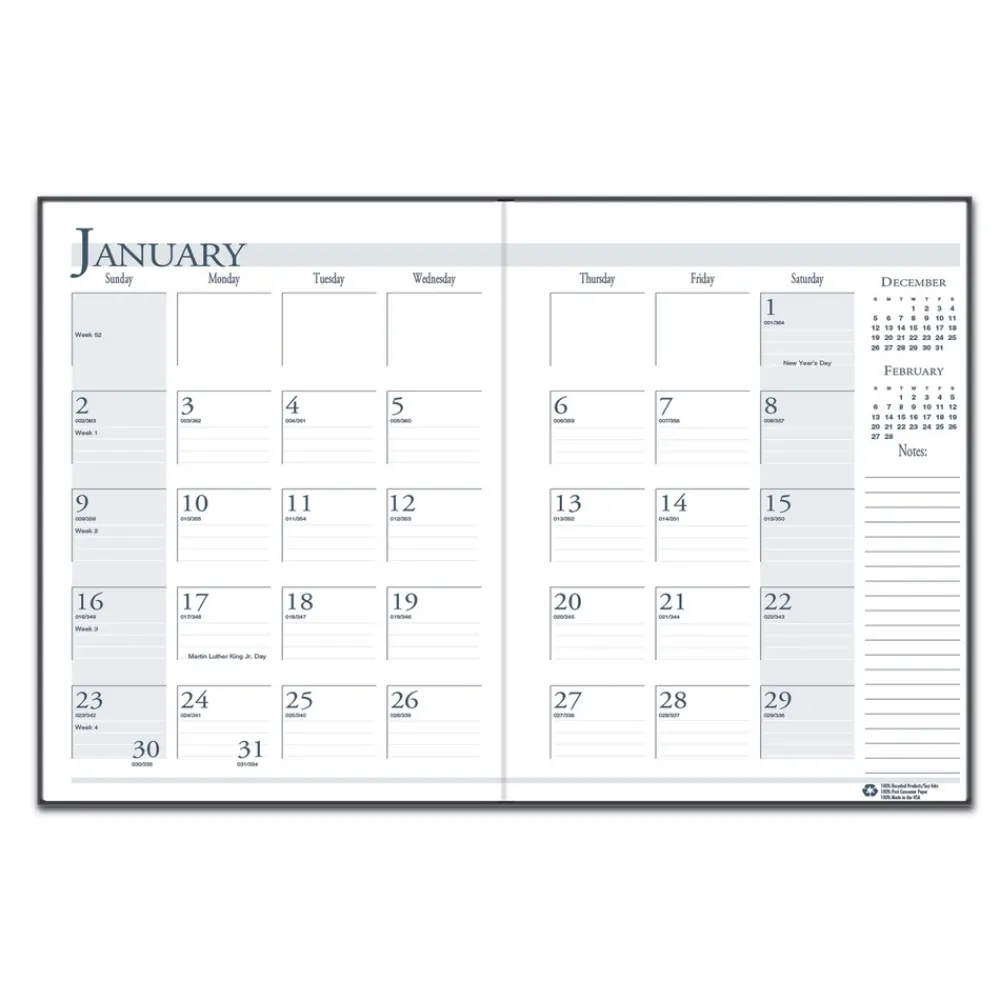 Stitched-book-style flat planner, with room to record necessary appointments and general information, is ideal for the busy professional. One-month per two-page spread with generous note space for important information. Lightly ruled daily blocks help keep notations neat. Includes numbered weeks. Additional information sections include important holiday dates, a three-year reference calendar and a lined contact-information page. Made entirely of recycled materials.