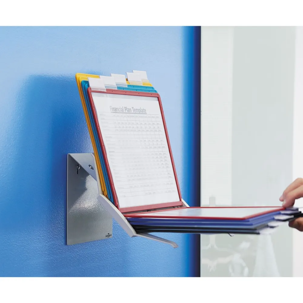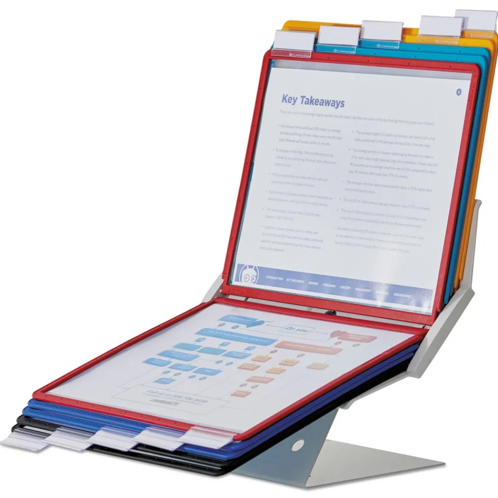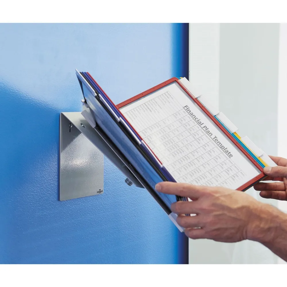 Organize and quickly access frequently used documents with the VARIO Pro 10-Panel Desktop and Wall-Mount Reference System from DURABLE. This German-designed organizational powerhouse is meticulously crafted for anyone seeking unparalleled efficiency. Made with German precision, this reference display system is a testament to quality, ensuring lasting durability. Say goodbye to flimsy alternatives and embrace the reliability of VARIO. Experience efficiency at your fingertips with easy-load, glare-free, and scratch-resistant pockets. Each high-quality sleeve is engineered to keep your paperwork crease and tear-free, even with frequent handling. The powder-coated steel base and non-slip grip also provide a stable foundation that stands up to heavy use. With 10 pockets capable of displaying up to 20 letter-size sheets, VARIO is the go-to solution for organizing schedules, SOPs, directories, class lists, instructions, charts, maps, emergency numbers, menus, team rosters – any frequently referenced paperwork. The perfect solution for high-traffic areas like lobbies, front desks, conference centers, warehouses and more, VARIO seamlessly integrates into your workspace. Whether positioned on your desktop at a 30 degrees or 60 degrees viewing angle or mounted on the wall (mounting kit included) depending on your needs, plus the patented rotating mechanism easily switches between portrait and landscape for optimal document orientation. Organize and color-code your documents with the assorted frame colors (2 black, 2 red, 2 yellow, 2 green, 2 dark blue) and 10 snap-on tabs. Also includes bracket, desk stand and optional wall-mounting kit. For over 100 years, DURABLE has been synonymous with quality, design, and functionality. As a testament to this legacy, DURABLE products combine innovative design with a wealth of experience. Trust in a brand that understands the importance of organization for enhancing productivity. Bring order to your daily routine and make referencing crucial information a breeze. Choose VARIO for an organized, streamlined, and optimized workspace. Choose DURABLE and experience the difference that quality and innovation can make.