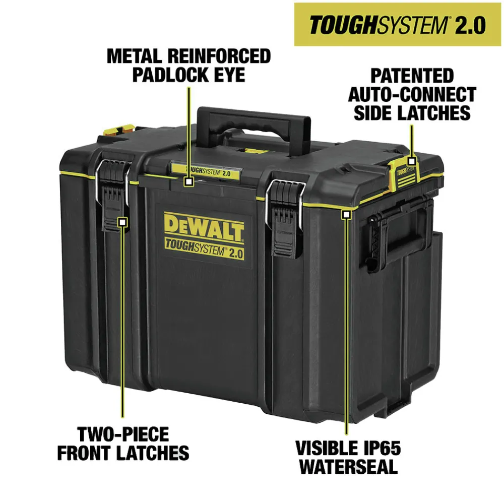 The ToughSystem 2.0 Extra Large Toolbox has patented auto-connect side latches, allowing for one-hand operation. It also has 2-piece metal front latches for added durability when securing tools inside the box. It is IP65 rated for dust and water resistance and has a 110 lbs. load capacity. The toolbox has a removable inner tray for optimal organization. The ToughSystem 2.0 Extra Large Toolbox is backwards compatible with any ToughSystem product.