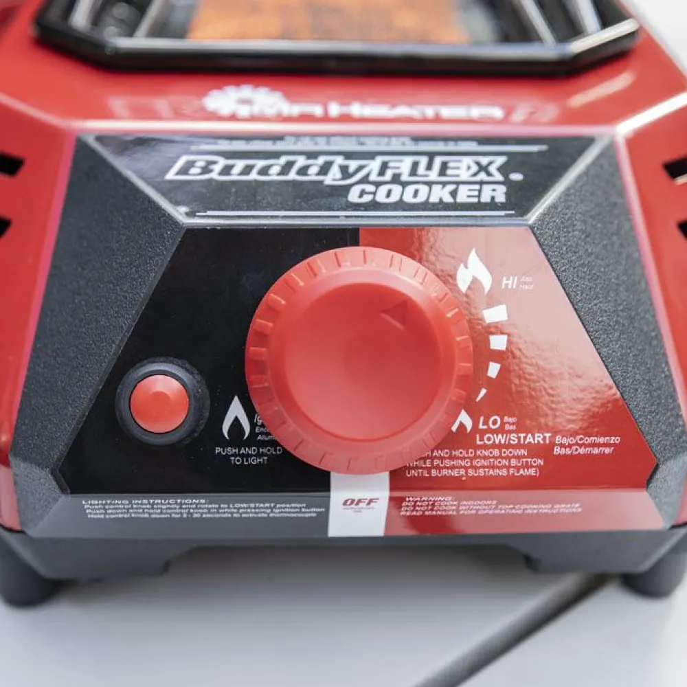 The 5000 – 8000 Infini-variable controls and all-new fiber mesh burner make cooking and cleanup a breeze. This portable cooker connects directly to the Buddy FLEX Heater using the integrated 28 in. Hose and custom quick connect fitting to ensure your safe and protected cooking in any environment