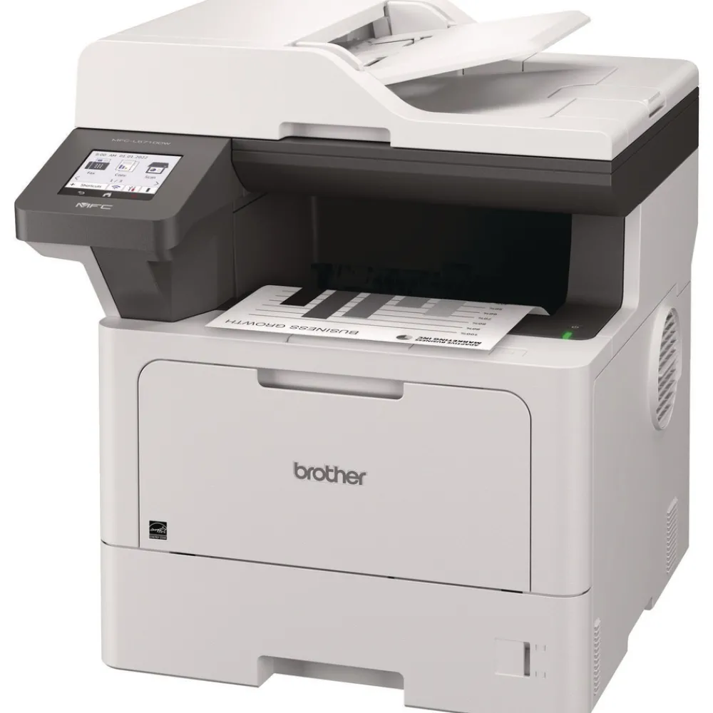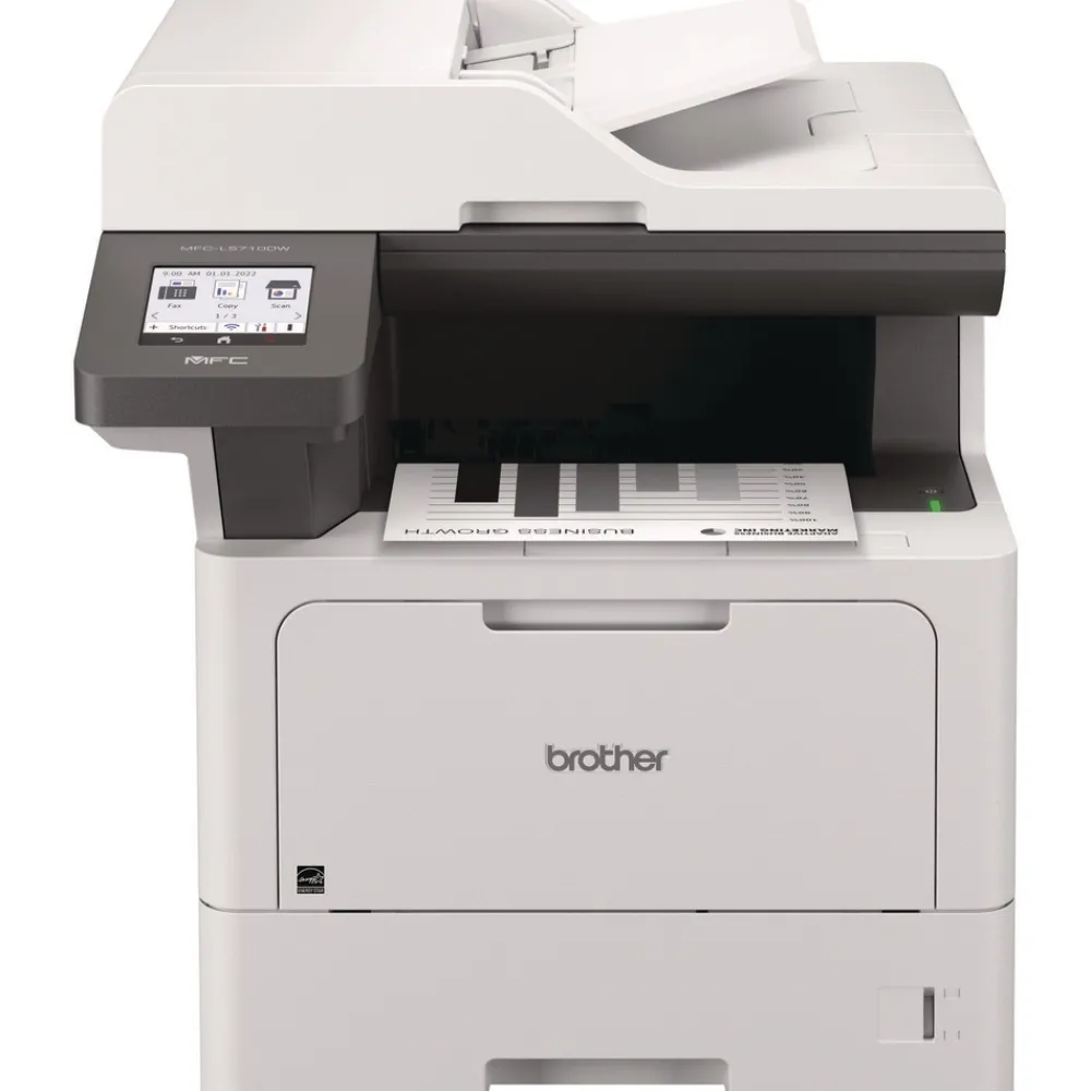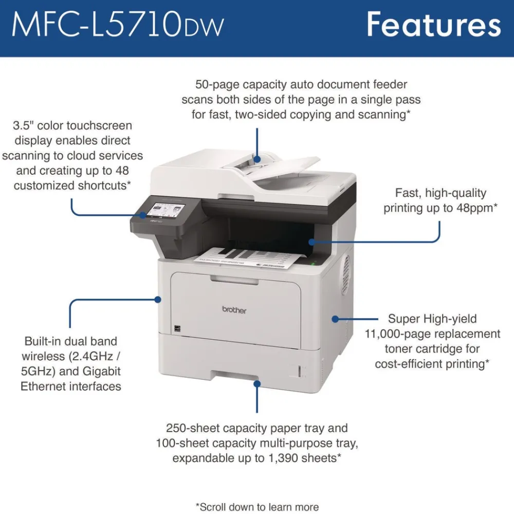 The Brother MFC-L5710DW business monochrome laser all-in-one printer is a great choice for busy offices and small workgroups that need cost-efficient printing, versatile paper handling, advanced security features, and reliable, high-quality output. This high-performance all-in-one printer helps to increase productivity with fast print and copy speeds up to 48 ppm. Delivers cost-efficient printing by using the Brother Genuine TN920XXL super high-yield replacement toner cartridge. Triple Layer Security features help to limit document and device access and protect against network intrusions. Offers expandable paper capacity that is scalable as your business needs grow. Quickly scan multi-page documents to a wide variety of destinations using the 50-page capacity auto document feeder. The 3.5″ touchscreen display allows for the creation of customized shortcuts to your most frequently used workflows. The MFC-L5710DW also provides flexible connectivity with built-in Gigabit Ethernet and dual band wireless networking, plus convenient mobile device printing to meet mobile workforce demands.