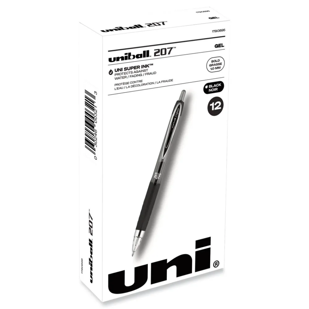 Stock your office, home or classroom with 207 Retractable Gel Pens from uni-ball available in various point sizes with a stainless steel tip that resists bending and breaking. Even-flowing, pigment-based gel ink delivers a smooth writing experience for intense, vibrant lines, ensuring that every mark is brilliantly communicated. Use these retractable gel pens for everyday writing tasks, check signing and all of your important signatures, trusting its quick-drying uni Super Ink. Innovative uni Super Ink technology effectively entraps the gel ink into the paper, producing fraud, fade and water-resistant documents that resist check washing or bleaching. A textured grip offers greater comfort and control as you continue writing, while a translucent ink window indicates the level of gel ink remaining, so you don’t run out unexpectedly. The sleek design of the 207 with modern metal accents gives the retractable gel pen a stylish touch.