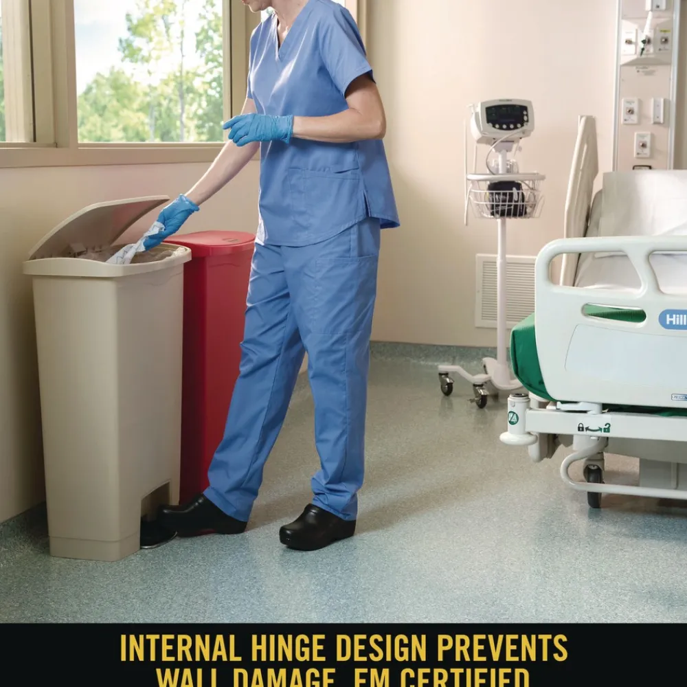 Designed to satisfy the diverse needs of any facility. Maximizes space efficiency with a small footprint and slim profile. Fits in even the tightest spaces. Internal hinge design prevents wall damage. Quiet and controlled lid-closure minimizes noise. Liner retainer band and cinch easily and securely holds can liners. Increased foot pedal clearance for easier access and operation.