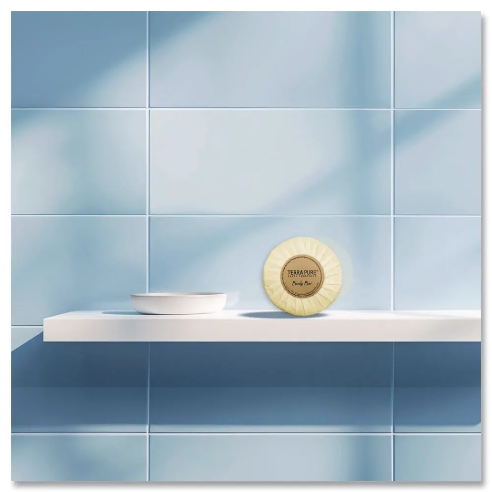 The luxurious Terra Pure cleansing bar features a subtle, refreshing green tea fragrance that gently soothes and uplifts the senses. Carefully formulated with nourishing olive oil and aloe vera extract, the cleansing soap bar provides a calming, hydrating cleanse suitable for all skin types. Our vegan-friendly, sulfate-free formula makes it a responsible choice for any hospitality setting. Thoughtfully wrapped in an elegant tissue pleat, it offers a refined presentation that enhances any guest bathroom. An EcoWell Health and Wellbeing group product, it is 100 percent paraben-free, gluten-free and cruelty-free; never tested on animals. The Terra Pure cleansing bar reflects a strong commitment to wellness, sustainability and ethical standards without compromising on luxury. Designed for today’s discerning guests, Terra Pure helps create a memorable, spa-like experience with every stay.