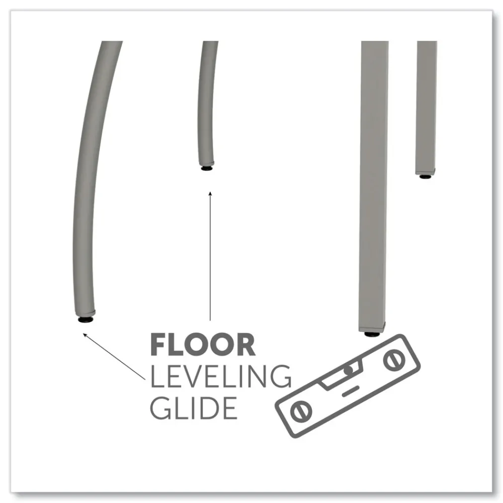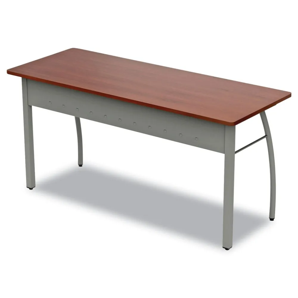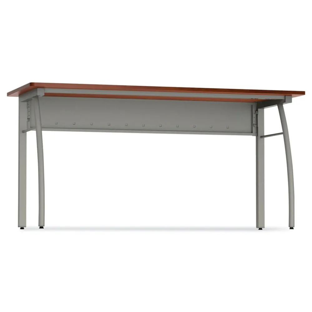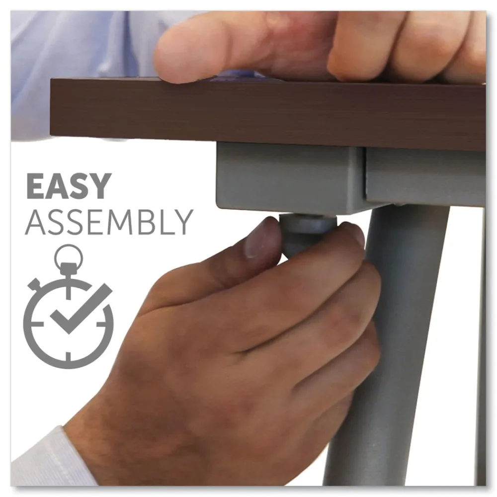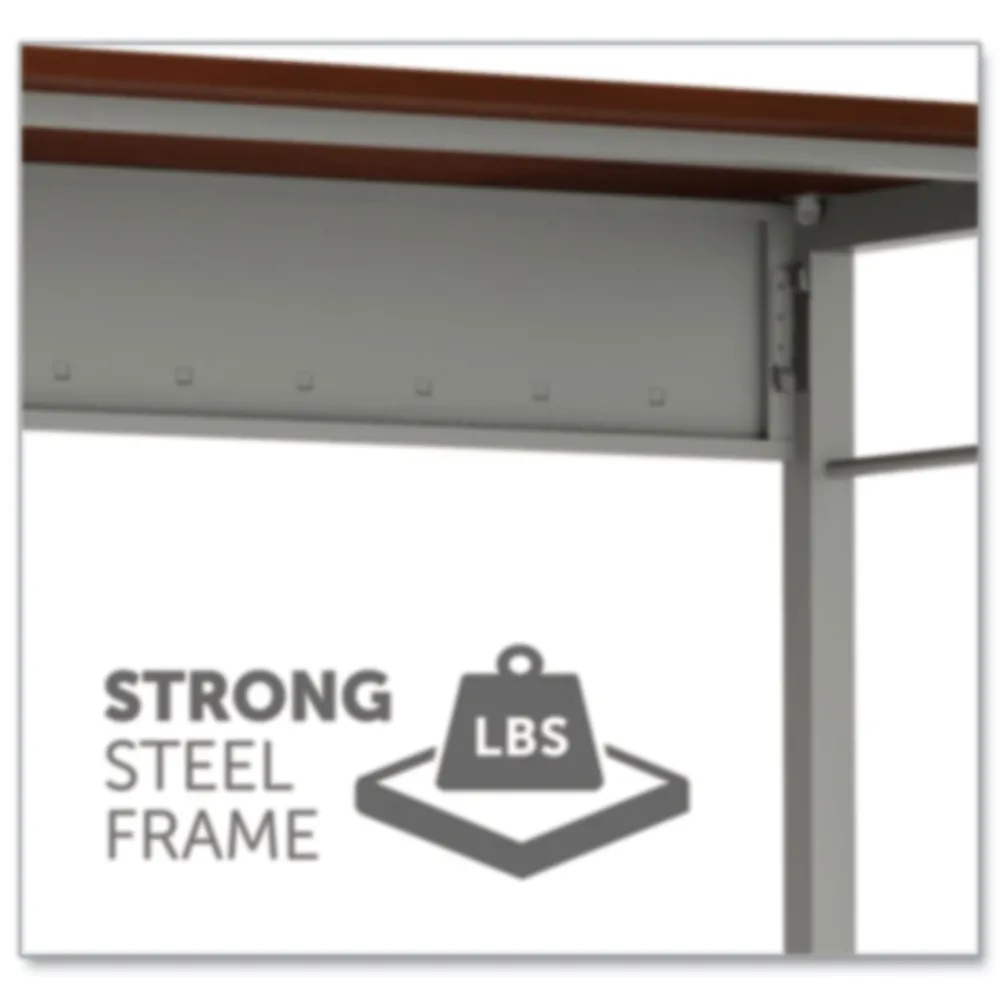 Scratch- and stain-resistant woodgrain laminate with durable edge and strong powder coated steel frame. Adjustable leveling glides for stability. Quick and easy assembly in minutes with no tools required. Configure multiple desks to perfectly fit your space. Includes metal modesty panels. Pedestals fit under desk.