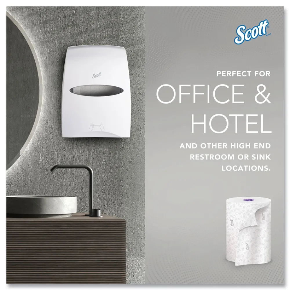 More than ever, hygiene plays a significant role in employee, guest, and tenant comfort and satisfaction. When designing our towel systems, we looked at what matters most to restroom users, hygiene, efficiency and sustainability. Scott Essential provides reliable balance of efficiency, performance and value. If you’re looking for high-capacity commercial paper towels compatible with most universal roll towel dispensers, the white Scott Essential High Capacity Hard Roll Paper Towels are an excellent choice for your business. The roll is compatible with a variety of Kimberly-Clark Professional dispensers and many universal towel dispensers. Plus, they are high-capacity, designed to reduce maintenance time, run-outs and complaints. These absorbent commercial paper towels are designed for efficient general-purpose cleaning and drying, so your employees and guests will use less, saving you money.