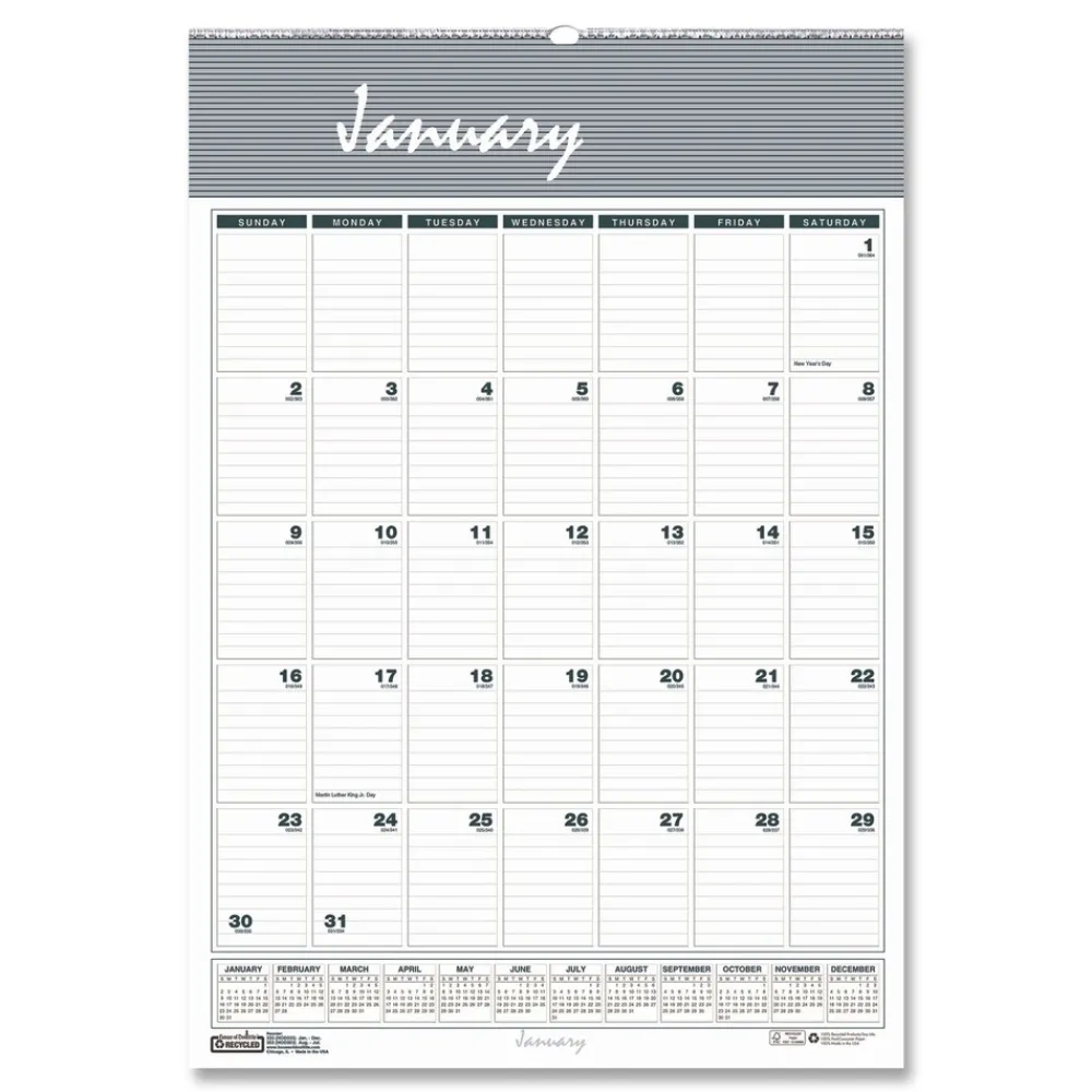 Ruled daily blocks keep notations neat. Full-year reference calendar aids in planning throughout the year. Neutral graphics match any decor. Wirebound with a full chipboard backer and a sturdy wire hanger. Made entirely of recycled materials.