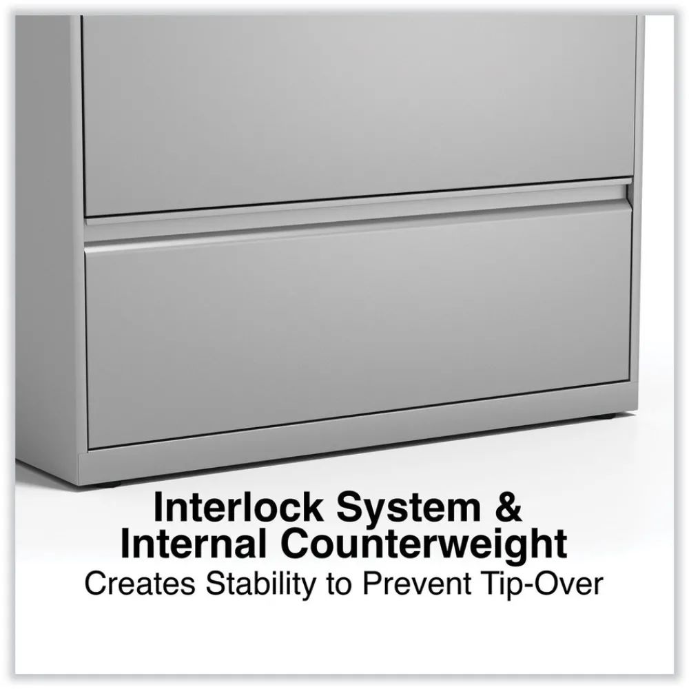 Drawers with side-to-side hang rails to accommodate letter/legal hanging files. Full drawer extension on steel ball bearing telescoping slide suspension helps drawers glide with ease. Stylish, full-width radius edge recessed pulls help to quickly open and close drawers. Anti-tipping interlock system allows only one drawer to open at a time. Single key core removable lock with two keys. Four adjustable leveling glides. Durable powder coated finish helps prevent scratches.