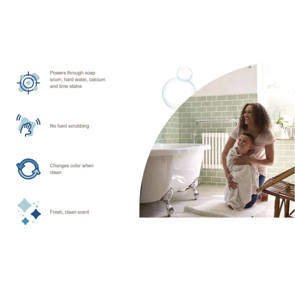 Takes the guesswork out of cleaning. Spray on the penetrating blue foam and OxiClean Stain Fighters go to work on contact, breaking up soap scum and hard water stains. When the foam turns white, just wipe and rinse to reveal a brilliant shine. Cleans with a fresh scent and no obnoxious fumes. Also removes dirt, calcium, lime, grease and grime. Great for use on tubs, glazed ceramic tile, fiberglass, shower doors, vinyl curtains, sinks, countertops and chrome fixtures.