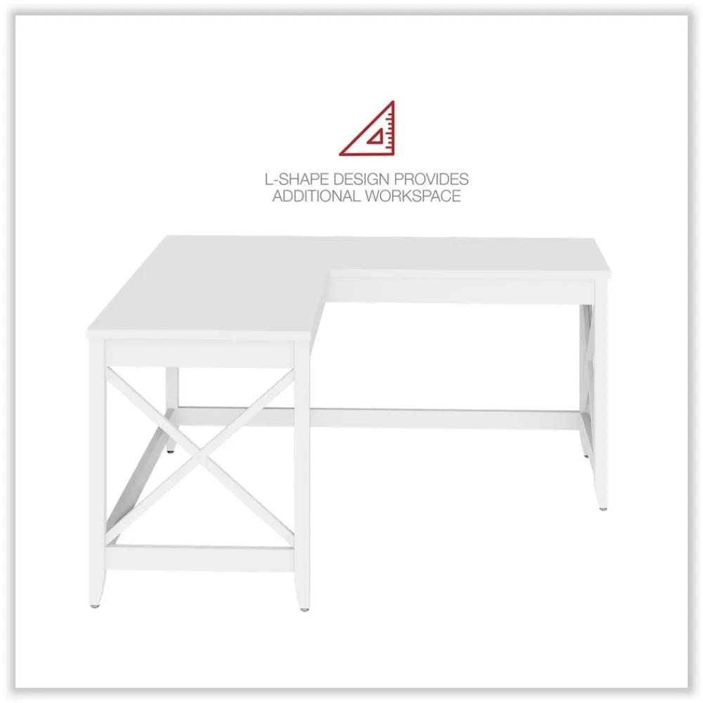 This stylish, L-shaped farmhouse desk with X accents on the side panels adds a touch of rustic charm to any room. Crafted with a smooth laminate wood top and sturdy white wood legs, this multi-function desk features a simple design without drawers, allowing it to fit perfectly into a corner and maximize your space. The wide tabletop surfaces provide ample room to work or display organizational and decorative items. With its open design, the desk maintains a light, airy feel and complements most décor styles. Some assembly is required.
