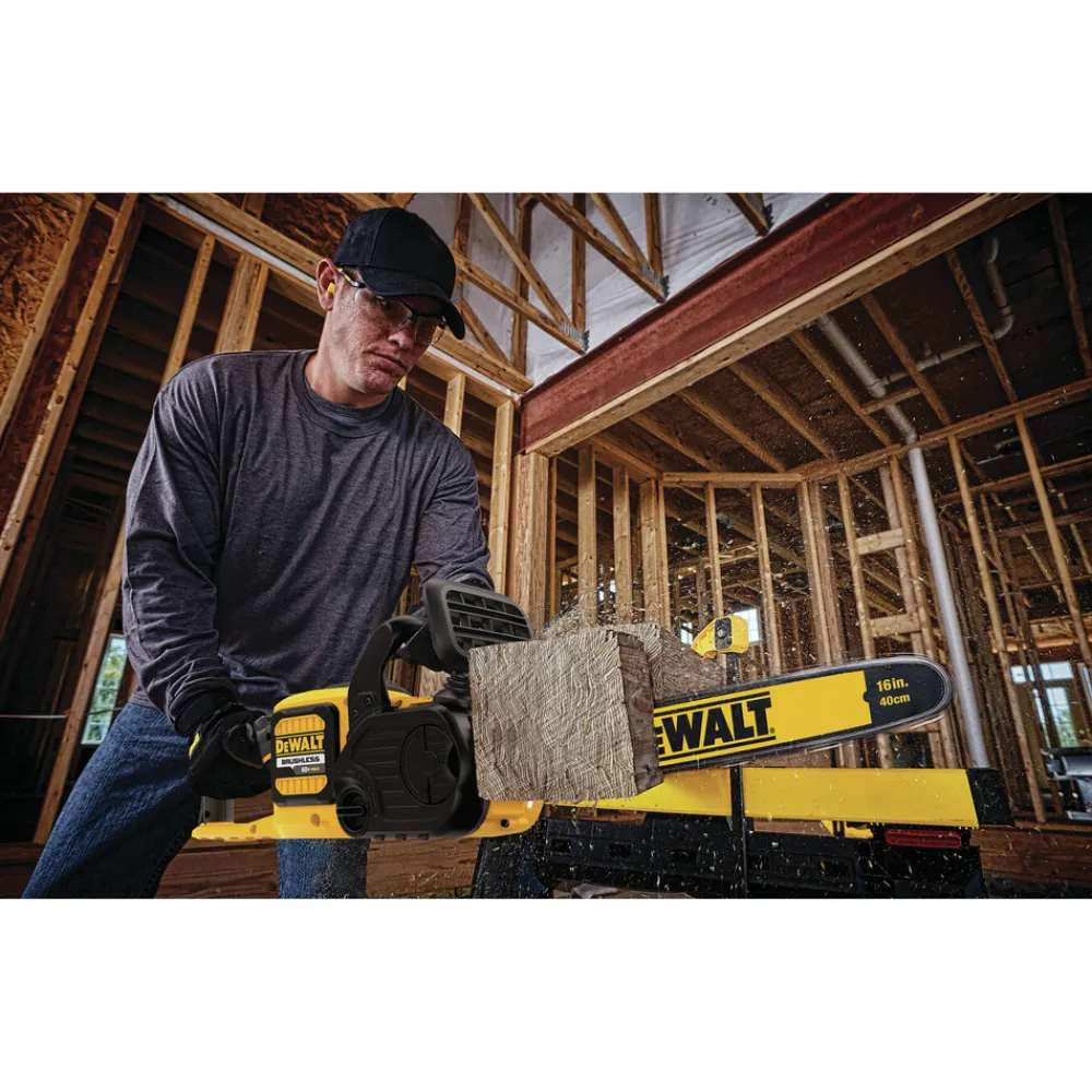 The FLEXVOLT 60V MAX Cordless Chainsaw powers through tough construction and demolition jobs. It features a low-kickback 16 in. bar and chain for cutting through large limbs, logs, and thick beams. It gives you the power you need with the convenience of our FLEXVOLT 20V/60V MAX battery platform. Get up to 70 cuts per charge on a 6 in. x 6 in. pressure treated pine wood beam. This listing includes the tool only. Purchase battery separately.