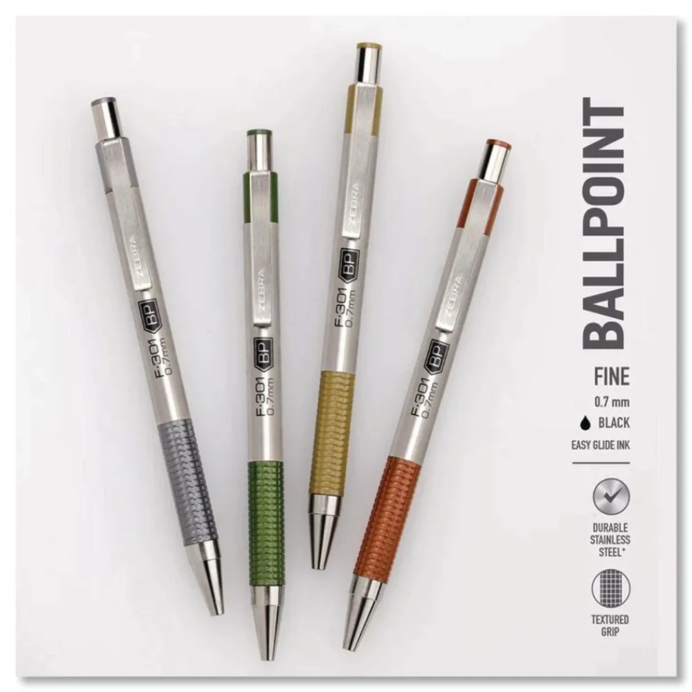 Zebra Pen F-301 Earthy Tones Retractable Ballpoint Pen blends timeless design with a natural aesthetic. Featuring a stainless-steel barrel and accented with refined neutral hues-this sleek, minimalist pen is perfect for those who appreciate simplicity, mindfulness, and style. With a 0.7 mm fine point, smooth ink flow, and a matching comfort grip, it delivers a precise and enjoyable writing experience. Its durable metal clip attaches easily to notebooks, planners, or pockets, while the shorter barrel design allows for easy portability.Perfect for work, school, journaling, or creative expression, the F-301 Earthy Tones brings elevated elegance to any writing task.