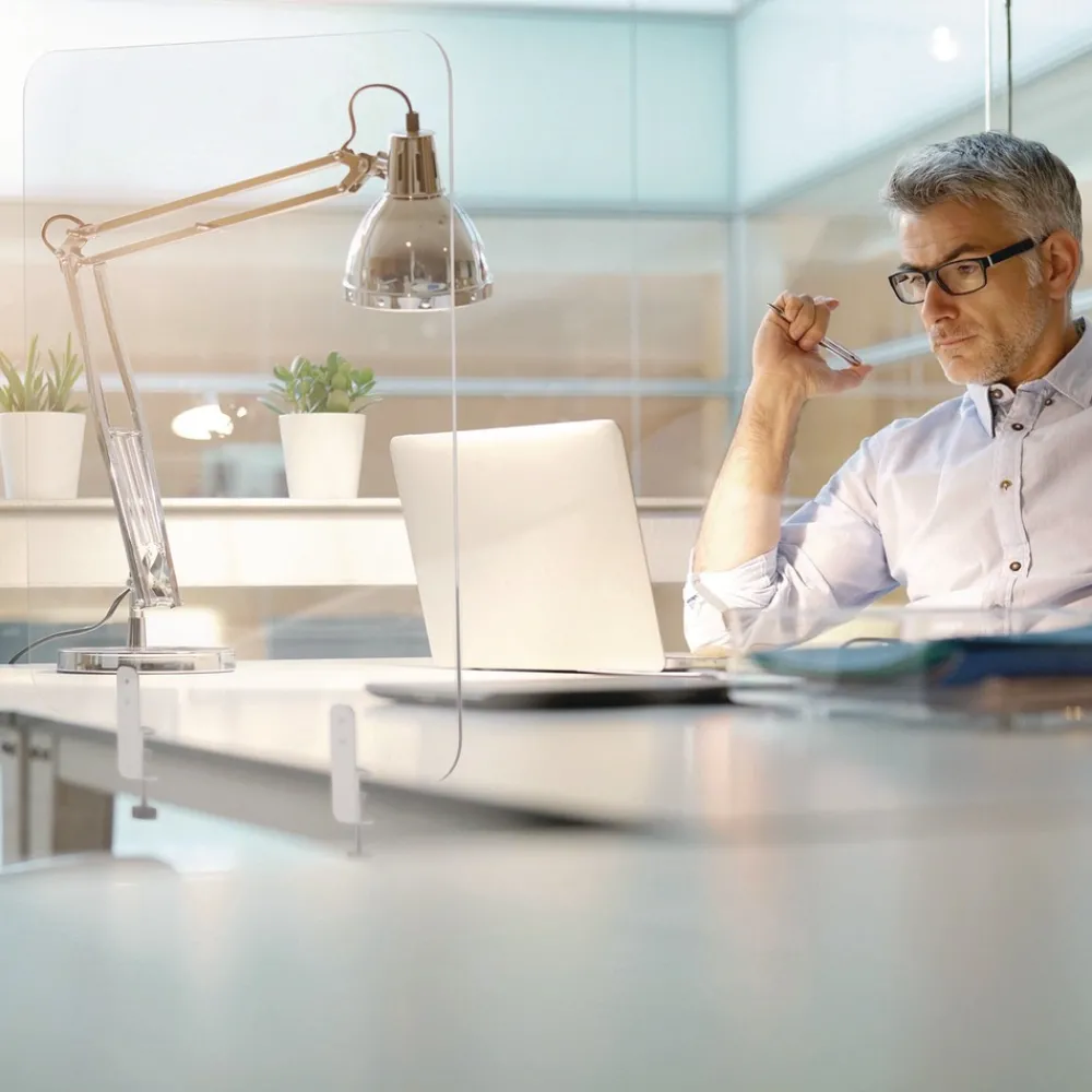 Due to the COVID-19 pandemic, social distancing and personal protection have become the new norm in order to stay safe. MasterVision introduces to you the Protector Series, designed specifically to protect you in public spaces. The Protector Frameless Glass Desktop Divider is an important tool that helps users maintain contact while still being protected. Ideal for shared office spaces and other public settings. Extremely easy to clean and sanitize. Features a pair of robust clamps which attach to the tabletop or desktop.