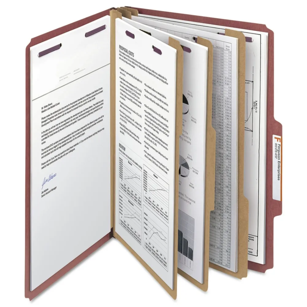 Minimize the time you spend searching for documents and increase the efficiency of your filing system. Smead’s Pressboard Classification File Folders with SafeSHIELD Fasteners make it easy to organize your critical information by providing a number of different filing surfaces that can be used to separate your documents in subcategories and keep them in proper sequence. Purposefully designed to provide a solution for the most common fastener issues, our Pressboard Classification File Folders feature SafeSHIELD Coated Fasteners that help you avoid hand injuries, ripped papers and excessive fastener crinkling. The 2 in. expanding spine made of tear resistant material offers greater storage capacity for bulky projects. Compatible with our Viewables Multipurpose Labels (sold separately).