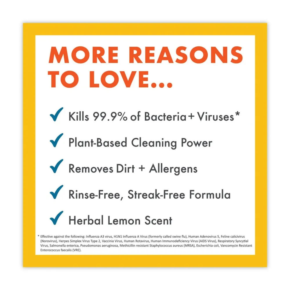 Multitasking at its best! This disinfectant cleans, deodorizes and disinfects in one easy step. No need to rinse, even on food contact surfaces and children’s toys. Ready-to-use formula requires no mixing. The active ingredient Thymol kills cold and flu viruses on hard, non-porous surfaces and eliminates 99.9% of household germs and allergens. It dries streak-free and leaves no residue. Free from harsh chemicals, this plant-powered lemon scented formula is safe to use around kids and pets.