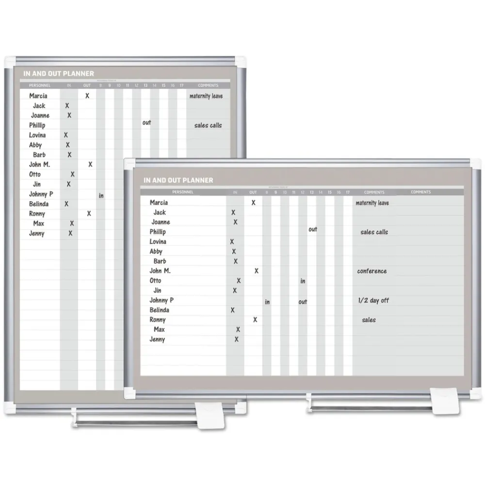 In and Out board features rows for employees or visitors and is perfect for displaying staff schedules. The Magnetic Gold Ultra dry erase lacquered steel surface is recommended for frequent use. The Sliding aluminum pen tray keeps pens and magnetic accessories where you want them. Aluminum frame features the four-corner system for easy mounting.