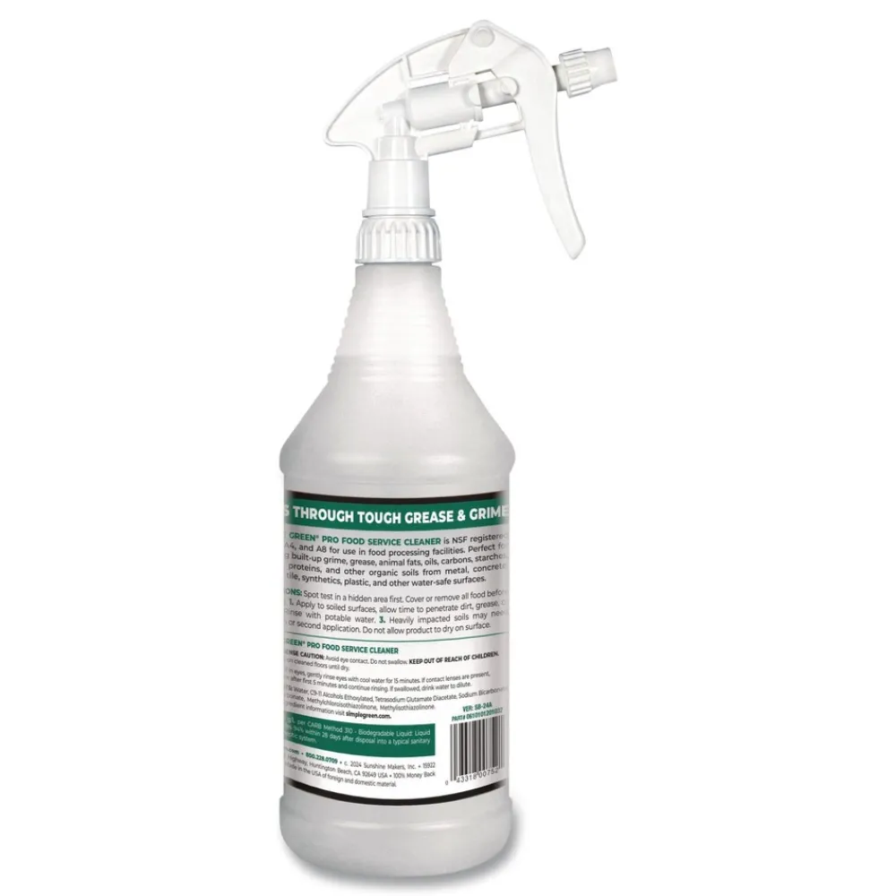 Simple Green PRO Food Service Cleaner is a powerful, professional-strength cleaner and degreaser that cuts through even tough baked-on foods, grease, and built-up grime without harsh chemicals. NSF registered A1, A2, A4, A8, B1 and C1 for use in commercial kitchens and other areas where food is prepared or handled. PRO Food Service Cleaner is the perfect choice for restaurants, bars, cafeterias, food trucks, bakeries, coffee shops, lunchrooms and more. Works great on all washable surfaces including counters, walls, floors, appliances, cooking equipment, stoves, range hoods, utensils and laundry. The clean-rinsing formula contains no added color or scent. Convenient, ready-to-use trigger spray formula.