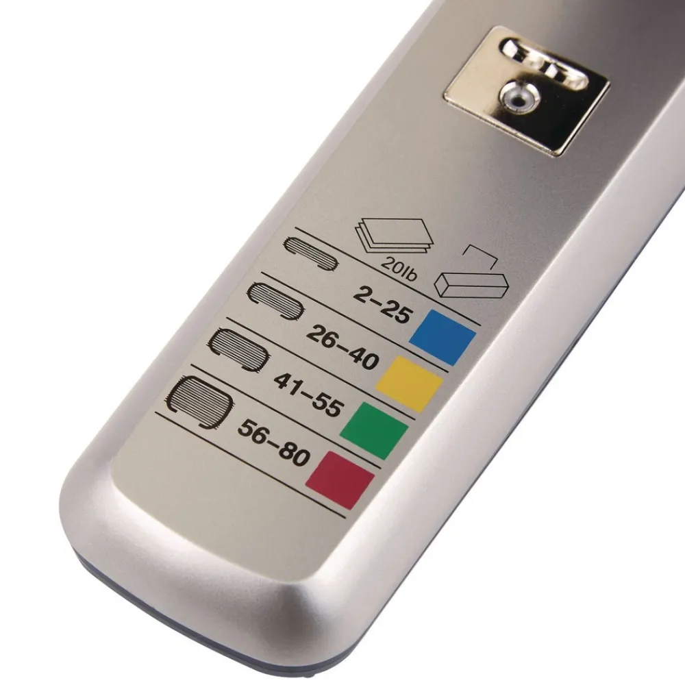 Easily staple nearly any paper stack with this cartridge-based heavy-duty stapler. Each cartridge is color-coded, and each color represents a maximum number of sheets that can be effectively stapled. A front-loading design with a rear push-to-open button make it easy to change cartridges. The stapler’s long handle provides greater ease of use, and its lightweight design allows for portability. A starter set of cartridges is included.