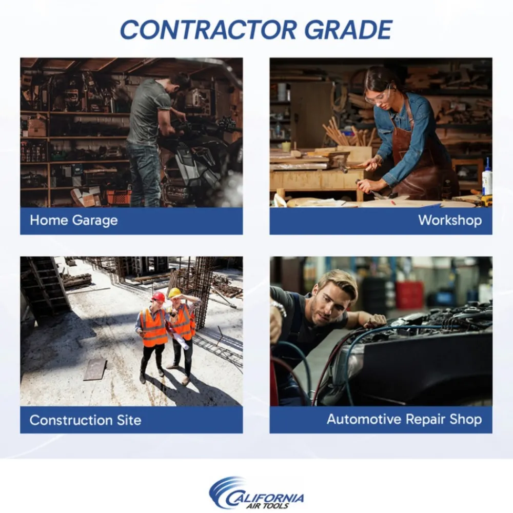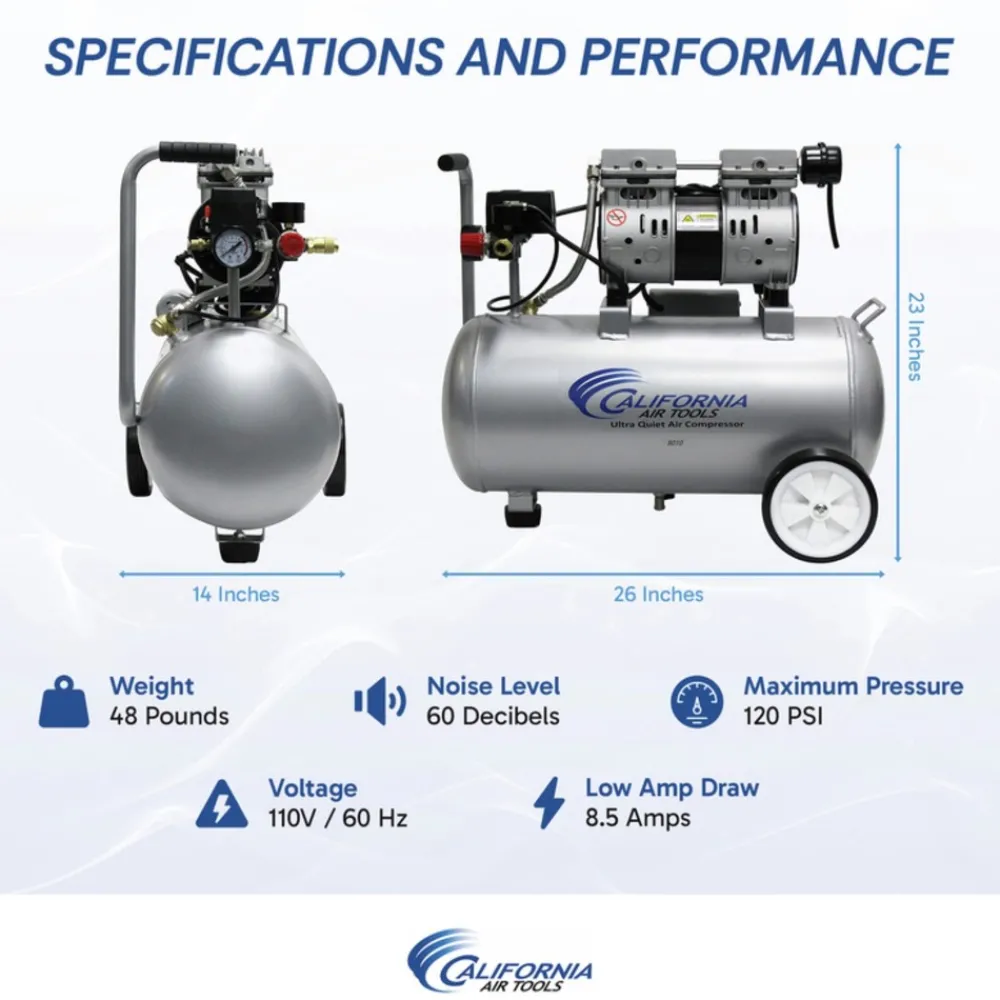The California Air Tools 8010 1 HP 8 Gallon Ultra Quiet Steel Tank Air Compressor is designed to be one of the quietest air compressors in the industry having only 60 dB of sound. The powerful 1.0 HP motor operates at only 1,680 RPM creating less noise and less wear. The CAT-8010 Air Compressor has an oil-free dual piston pump designed to have a life cycle before wear of 3,000 plus hours compared to other comparable air compressors with life cycles of 500 hours or less. The large 8.0 gal. Steel Air Tank is lightweight and the wheel kit makes it very easy to transport.