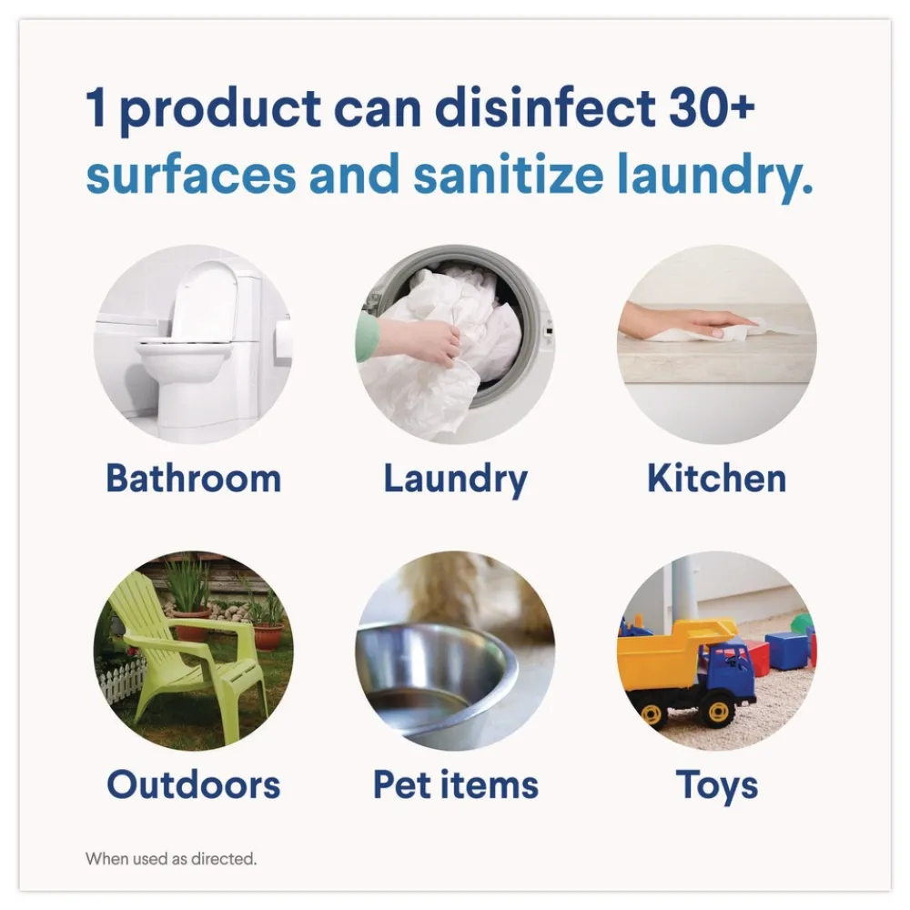 Contains CloroMax Technology to keep clothes whiter longer and protects household surfaces by reducing soil adhesion as it cleans so stains won’t stick and cleanup is easier