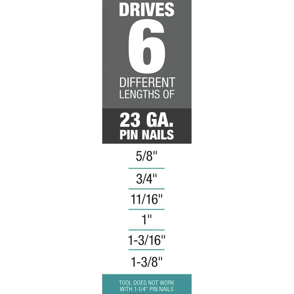 Drives 6 different lengths of 23 gauge pins (5/8″, 11/16″, 3/4″, 1″, 1-3/16″ and 1-3/8″); magazine capacity up to 120 pins