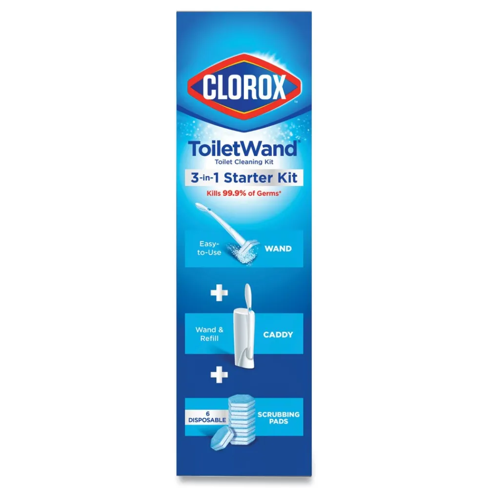 Clorox ToiletWand Disposable Toilet Cleaning System is a convenient way to a quick clean toilet. The starter kit contains one wand, 6 refills and one storage caddy to get you started on a deeper clean. Each disposable head is preloaded with Clorox Cleaner with 4x the powerful scrubbing action to clean tough stains, kill germs, remove rust, calcium and limescale while it disinfects and deodorizes with ease. Based on comparative lab tests, the toilet wand cleans better than a brush. The sponge like cleaning head is shaped so that you can get into every nook and cranny needing cleaning and germ control while killing 99.9 percent of germs like staphylococcus aureus, salmonella enterica, rhinovirus type 37 and influenza A. This all in one system is designed so that you get a brand new cleaning sponge every time you clean without having to touch a yucky brush. Ideal for use in day care centers, offices, schools, restaurants and other commercial facilities. Just click your way to a cleaner toilet with the Clorox ToiletWand Disposable Toilet Cleaning Starter Kit.