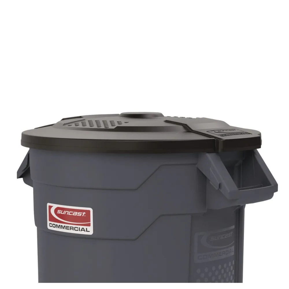 The Suncast Commercial Utility Trash Can Lid, made of durable resin construction, is designed to fit on Suncast Commercial utility trash cans. The lid securely fastens to the trash can with an easy snap-on design. This lid features tiers specifically made to avoid pooling of water, making this lid perfect for indoor or outdoor use!