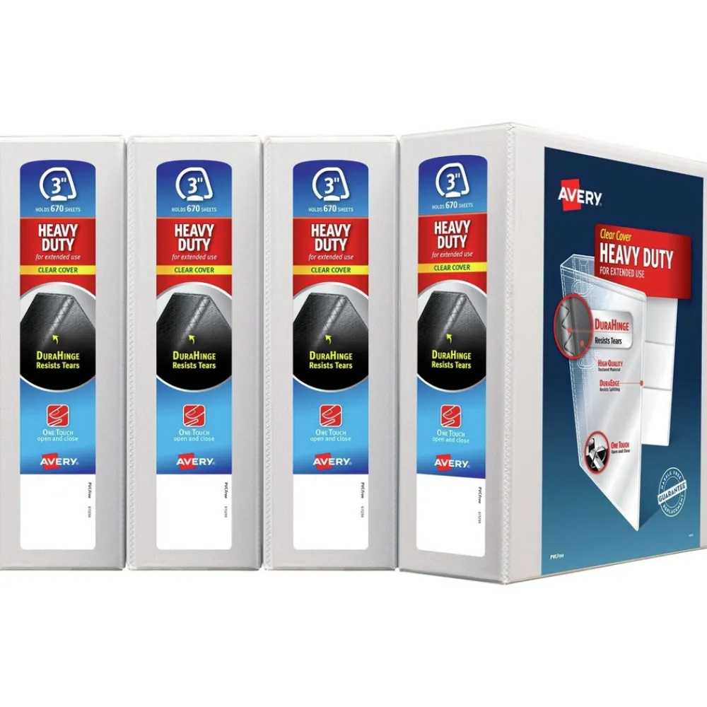 Avery 79193 11 in. x 8.5 in. 3 Rings 3 in. Capacity Heavy-Duty View Binder with DuraHinge and Locking One Touch EZD Rings – White (4/Carton)