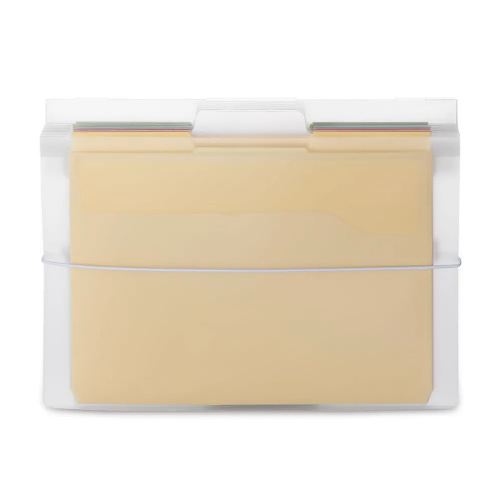 Saves desk space by utilizing often overlooked wall space. The six cascading pockets are removable to make viewing and access to documents easy. An elastic cord closure allows for secure and easy transport. Colored pockets each hold 50 sheets. Clear pocket on front allows for extra storage. Convenient loop on top for easy hanging. Durable poly material is tear- and moisture-resistant. Blank label sheet included.
