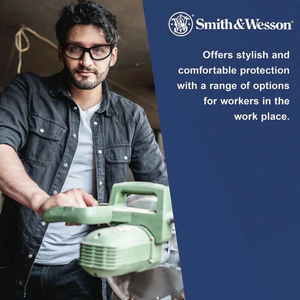 Smith & Wesson Code 4 Safety Glasses are a smart way to provide all-day comfort and protection, for both work and play. The stylish, minimal black frames hold smoke colored lenses (ideal for outdoor or bright environments) with a 7 base curve. The ribbed nose cushion helps keep the glasses from slipping and the contoured temple tips give the wearer a precise fit. The hinge stop helps prevent lens damage, so the protective glasses are really built to last. These glasses provide 99.9% UVA / UVB / UVC protection and meet ANSI Z87.1+ standards for high impact. No matter where you’re using them – at work or at home – Smith & Wesson Code 4 Safety Glasses deliver the comfort and protection you need.
