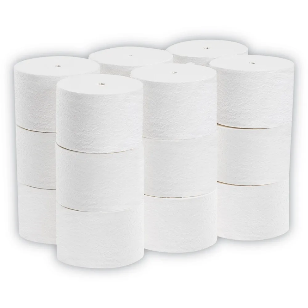 Stock your restrooms with premium, ultra-soft bath tissue! Coreless rolls provide up to two times the number of sheets as standard rolls, saving you time and money. Unique packaging allows easy storage and minimizes waste.