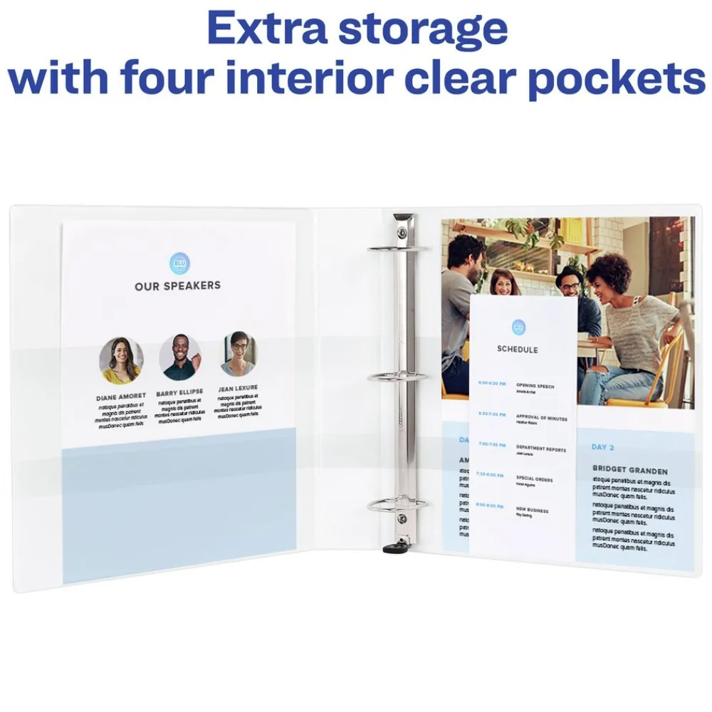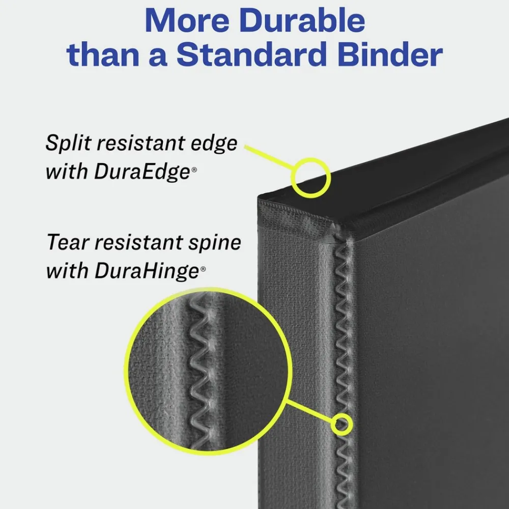 View Binder with EZD rings was designed with a purpose – to hold more pages in less space. EZD rings provide an increased capacity when compared to the same size slant or round rings. Tear-resistant DuraHinge design is stronger and lasts longer. DuraEdge feature makes the sides and top more pliable, providing greater split resistance. Deeply textured film offers a smoother finish and features a linen pattern for a high-quality look and feel. Durable construction is ideal for frequent referencing. Organize and secure papers within 4 interior pockets. Pages lie flat with back-mounted rings. Sturdy construction and clever design set a new standard in binder performance. Customize your binder with free templates and designs at Avery Design and Print Online.