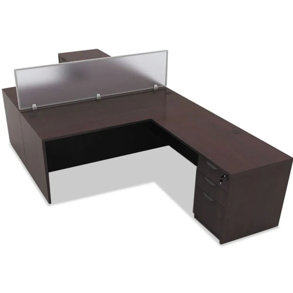 Semi-transparent frosted panel creates a private desk area while allowing light to filter through