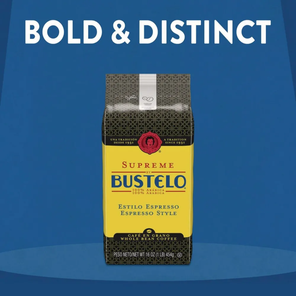 Estas invitado! Supreme by Bustelo espresso style whole bean coffee is a premium Cafe Bustelo coffee product specially roasted for a uniquely bold taste and complex aroma. Every cup of this medium dark roast coffee delivers a distinct, vibrant flavor that stands up to milk and sugar. Thanks to its whole bean form, you can grind your coffee exactly the way you like it for virtually any brewing method. It’s the perfect way to enjoy a rich and flavorful cafecito at home, whenever the mood strikes you. Buy a bag today for a Latin-inspired coffee experience that’s truly supreme.