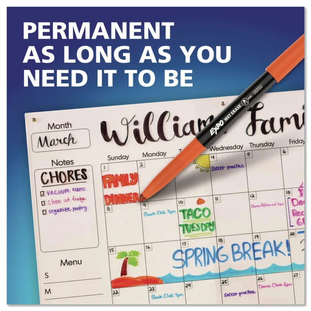 Adapt and evolve your ideas with ease using EXPO Wet Erase Markers. These EXPO markers are permanent until you want it gone; with water-activated erasing technology they wipe clean with water when you’re ready for a fresh start! These markers make vibrant, sharp marks and are perfect for capturing plans that last, labeling with flair, or creating colorful displays on glass, whiteboards, and other non-porous surfaces.