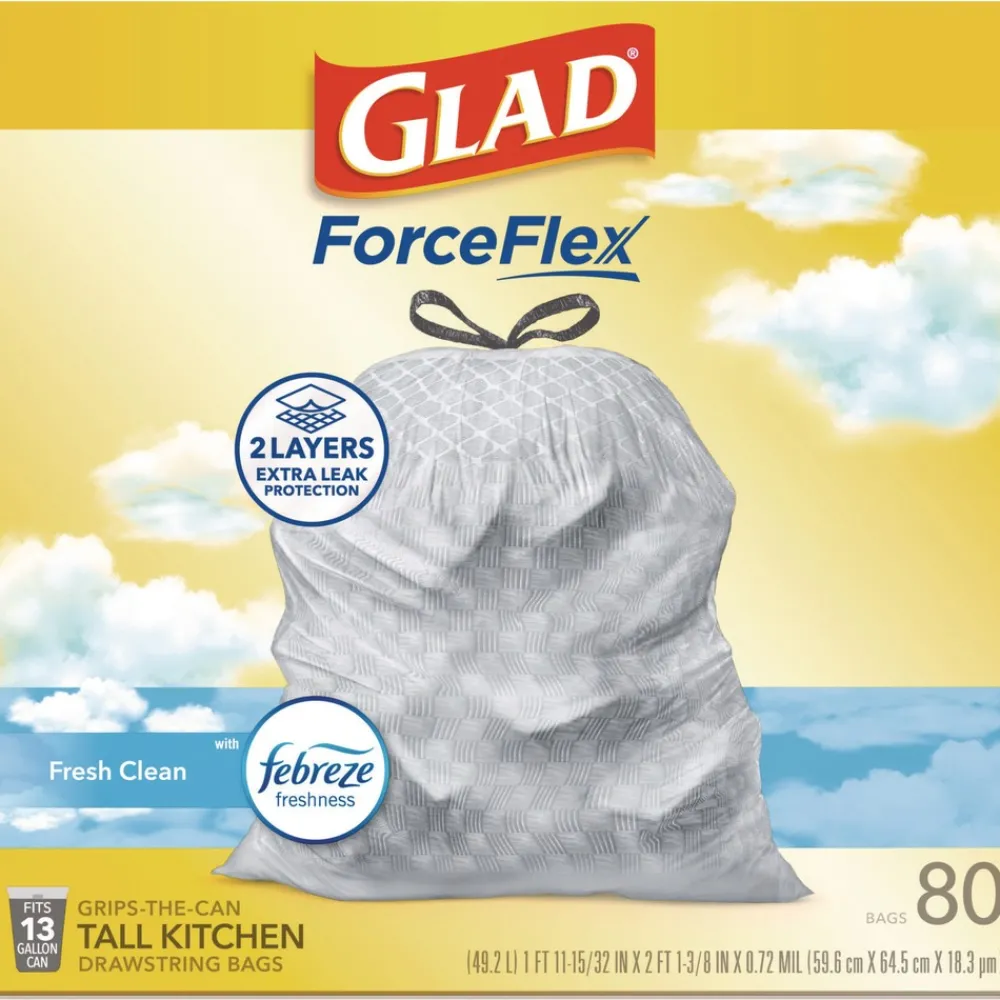 Fight nasty kitchen odors with Glad trash bags. Glad Kitchen Drawstring Trash Bags are designed with ForceFlex technology to give extra flex as it expands around sharp edges and heavy loads, so you can pack it in while resisting tears, rips and punctures. Keeps your kitchen smelling pleasantly fresh with long lasting odor control. Let the stretchable strength of Glad handle all the messes our busy daily life can throw at it and then some. With double-sided seals and a reinforced bottom, these bags are designed with RipGuard and LeakGuard technology to prevent seepage of liquids and keep trash contained. The durable Grips-The-Can Drawstring ensures a tight grip on the trash can to keep it in place. Take the trash to the curb with no fear of leaks and tears, and no frustration. Keep your kitchen smelling clean with the stretchable strength of Glad. Ideal for use in offices, schools, daycare centers, restaurants, hotels and other commercial facilities.